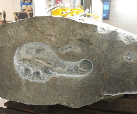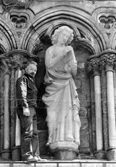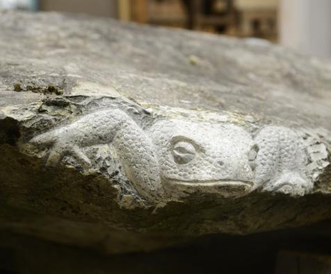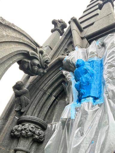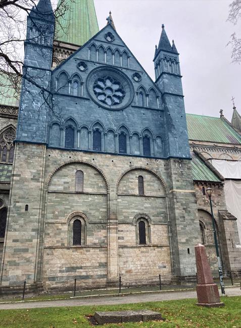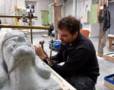 slutten av året er alle krefter satt inn på huggingen til Sørgavlen. Vi er også i gang med å hugge en kopi av middelalderskulpturen fra innsiden av koret i Stavanger domkirke som forestiller Magnus Lagabøter. Oppdraget er for Nasjonalbiblioteket som 1. februar åpner en ny utstilling i forbindelse med markeringen av 750-årsjubileet for Landsloven av 1274. (Fig. 3) Vi har også bistått restaureringen av Stavanger domkirke med hugging av steiner til deres prosjekt «Domkirken 2025».