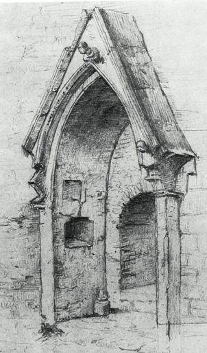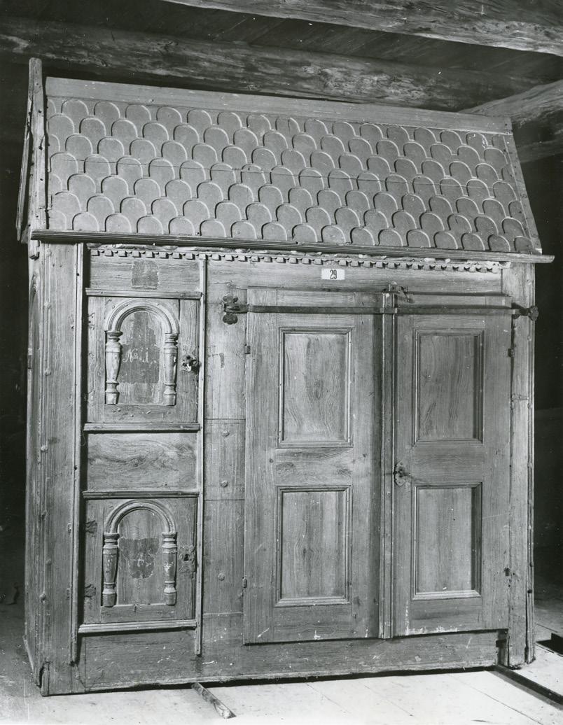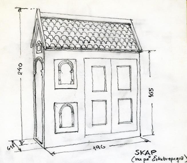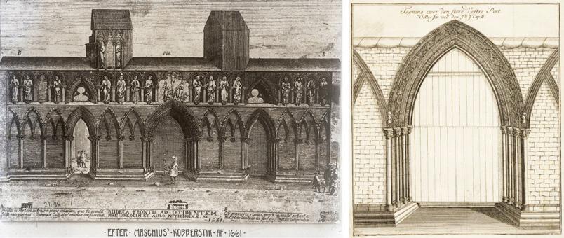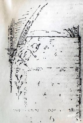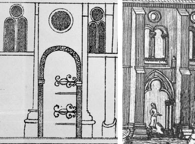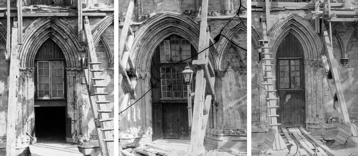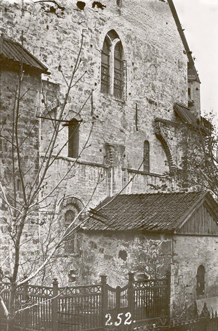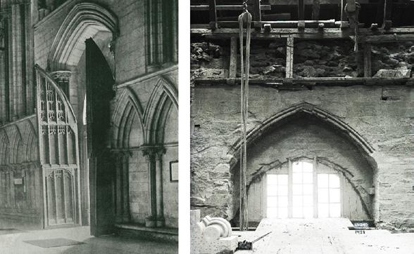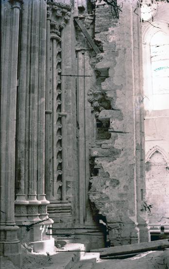 Fig. 3: Austveggen i søndre tverrskip før restaureringa, med dei tre etasjene eller nivåa med arkade, triforium og klerestorium. Til venstre den gjenmurte opningen til søndre sideskip i koret. Døra i altarstuken viser inngangen til Iver von Ahnens gravkammer. Arkivfoto 5852/teikning 1045.