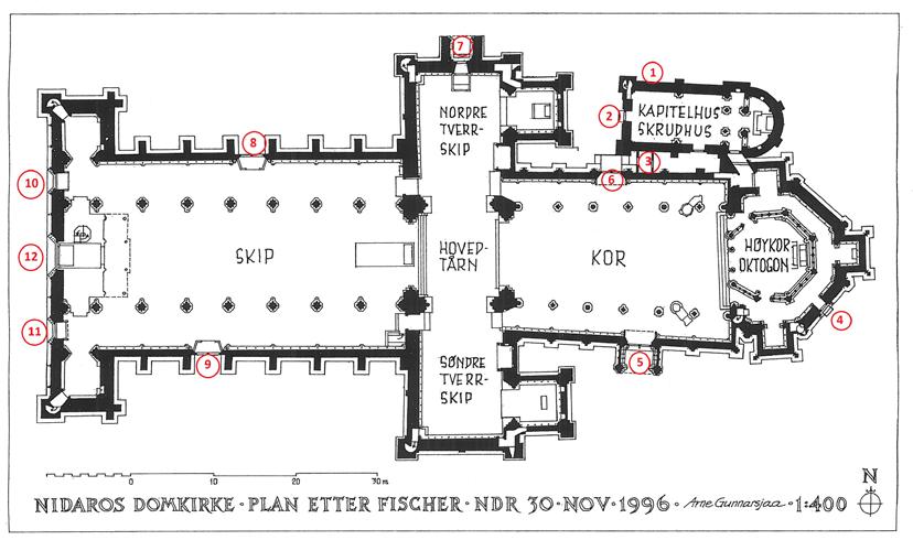 Nidarosdomens tverrskip er ein komplisert konstruksjon, med gangar mellom doble veggar, vindeltrapper som gir samband til dei øvre etasjane og andre bygningsdelar, og nesten usynlege inngangar til små kapell og ‘hemmelege’ rom. Gjennom gangane og trappene kan handverkarane lett kome til dei øvre delane av murane og takverka for reparasjonar, og murgangane gjer også murane lettare og sparte mykje stein ved bygginga. Sjølv om kjeldene er få, er det all grunn til å tru at tverrskipsgangane før reformasjonen også spelte ei liturgisk rolle ved prosesjonar. Ved synging og messing frå ulike stader oppe i etasjene kunne det skapast ein vakker romklang under dei høge kvelva. (Fig. 1)
