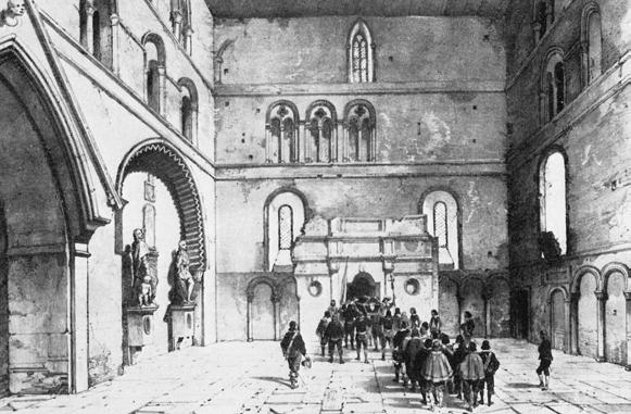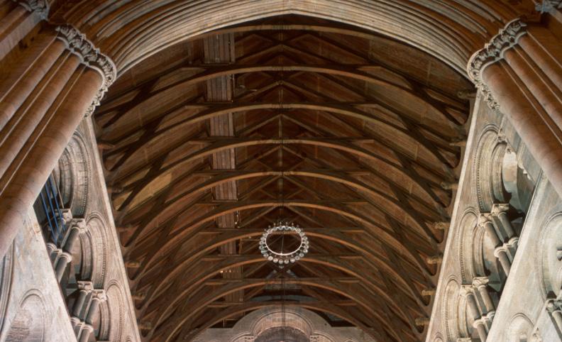 St John’s Chapel after restoration, with chevron or zigzag decoration in the entrance arch and on the vault ribbing. The half-piers have scalloped capitals, and the lapel stops are shaped as animal masks.