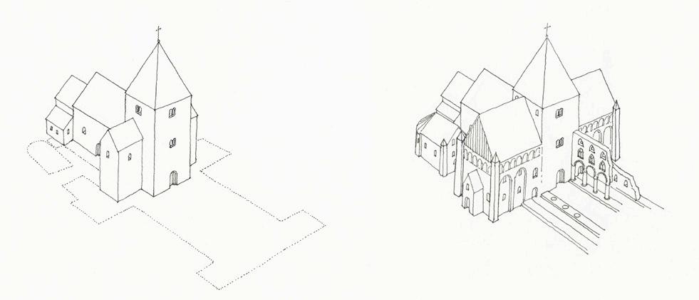 eitt på alle tre sider i begge tverrskipsdelane, men berre fullført med det indre murskalet på austsida av nordre tverrskip. Nord- og vestsida må derfor ha stått som ‘ringmurar’ i halv breidde ein periode før den indre muren vart oppført.