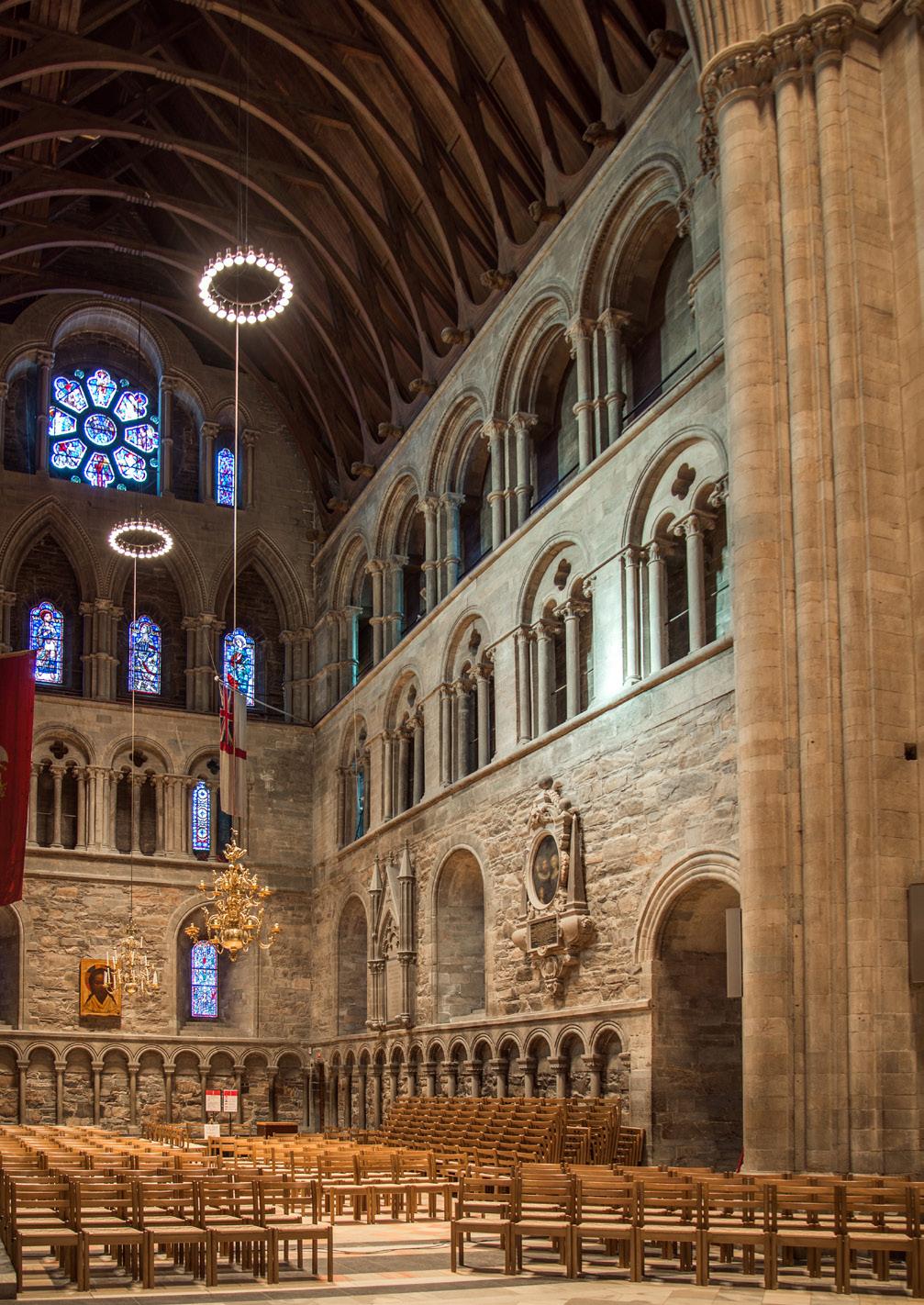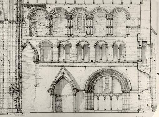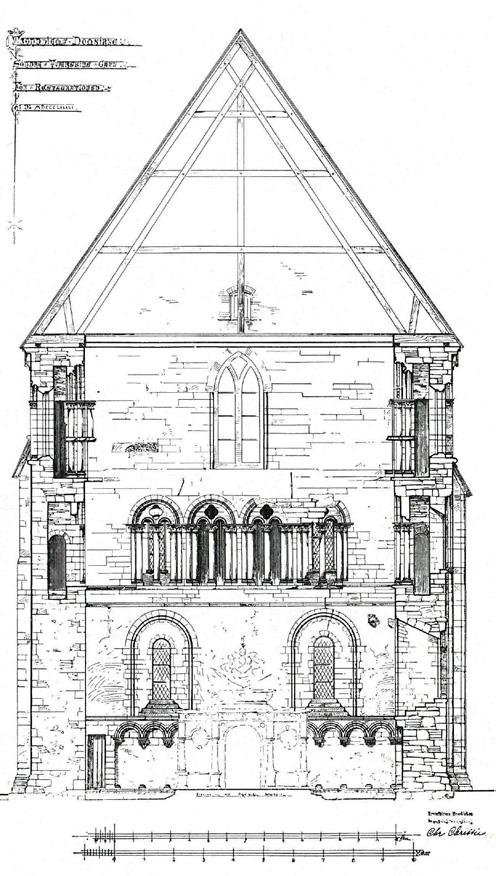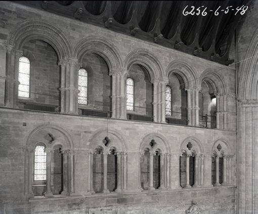 Tverrskipet er delt i tre nivå, høgder eller etasjer, med gavltrekanten som eit fjerde nivå. Dei blir kalt arkaden, triforiet (galleriet) og klerestoriet (lysetasjen) etter modell av det gotiske koret og skipet, sjølv om dette eigentleg er litt misvisande. Arkaden har massiv vegg og ingen pillarar, og triforiet og klerestoriet er svært like kvarandre, med ein passasje mellom dobbel vegg, vindauge i yttermuren og arkader inn mot midtrommet. (Fig. 3)