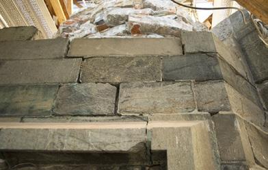 The masons placing new stones on the gable of the main entrance to Kristiansten Fortress. The stones are large, with a depth of up to 155 cm.