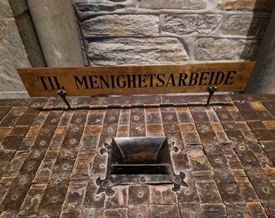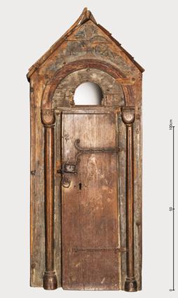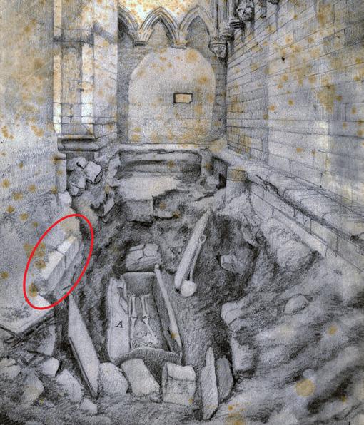 The bricked-up door to the corridor that led from the triforium in the south transept and into the pier of the central tower, where the corridor turned at a right angle towards the east and into the wall of King Olav Kyrre’s Christ Church. The door was later hidden behind a retaining wall, and the upper part of this has been removed to show part of the door.
