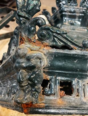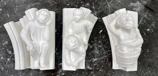 Gipsverkstedet har tatt en rekke avstøpninger på sørgavlen. De har også utført en god del eksterne oppdrag, både med produksjon og montering av listverk og rosetter. Begge våre gipsmakere er engasjerte i styret for Norsk Gipsmakerforening, et viktig sted å være for å bidra til å holde dette lille verneverdige faget i hevd. Ellers er også i år NDR sin egen julekrybbe til salgs i butikken, og Joseph Carter laget den siste figuren, oksen. Når denne er på plass, er krybba komplett. (Fig. 6)