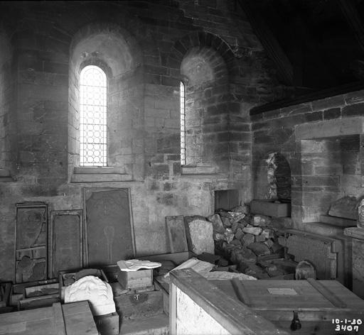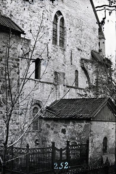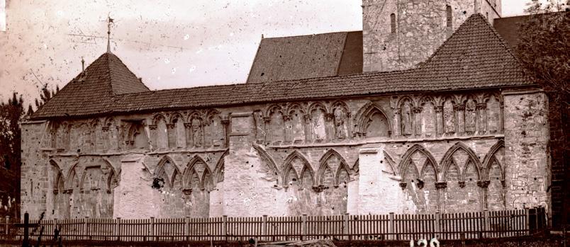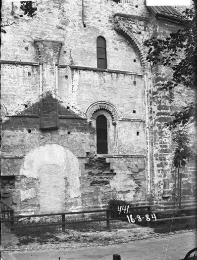 Fig. 8: Det gotiske skipet er lagt så tett inntil det romanske tverrskipet at det stenger fleire av vindauga heilt eller delvis. Mange spor i murverket viser at planen var å rive det gamle tverrskipet og oppføre eit nytt tverrskip med same stil og gesimshøgde som det gotiske skipet og koret.