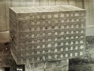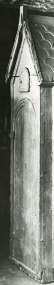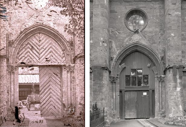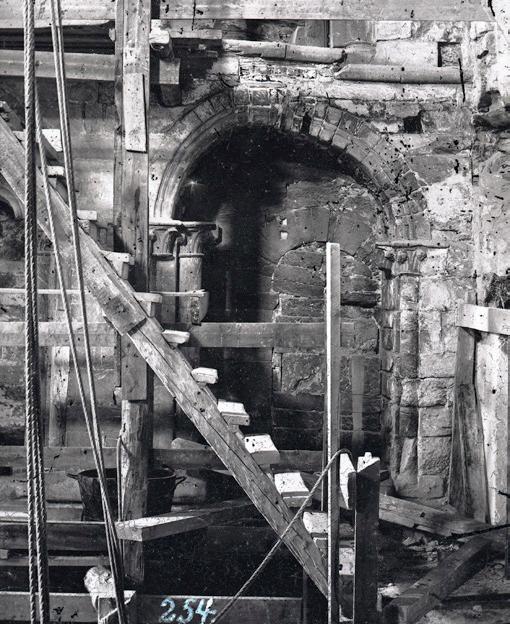 Fig. 4: Den gjenmurte døra til gangen som førte frå triforiet i søndre tverrskip og inn i tårnpillaren, der gangen snudde i rett vinkel vidare mot aust og inn i veggen i kong Olav Kyrres Kristkyrkje. Døra vart seinare skjult bak ein støttemur, og øvre delen av denne er fjerna for å vise litt av døra. Arkivfoto 6243