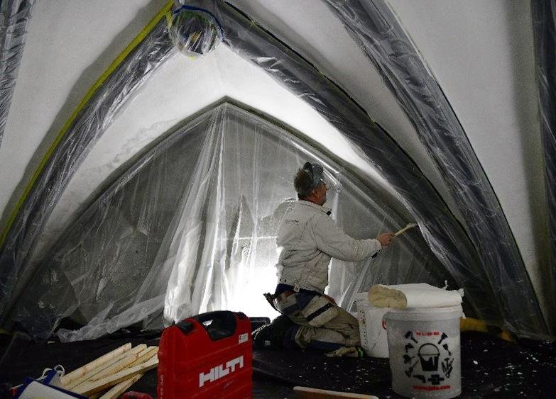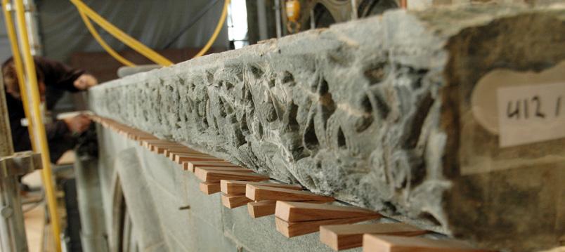 så godt som ferdig. Riggen er ferdigstilt og tegningene er klare. Det siste innbefatter nummereringen av hver enkelt stein. De fleste tiltakene er nå drøftet og godkjent av Riksantikvaren. Gipsmakerne har tatt en rekke avstøpninger denne sommeren, avstøpninger som kan komme steinhuggerne til gode når man skal lage nye kopier av dårlig stein. Steinhuggerne har så langt produsert nye dekksteiner på løpende bånd. Det må skiftes ut mye stein på de horisontale båndene, der det dessverre viser seg at Bjørnålisteinen fra Mosjøen ikke holder ønsket kvalitet. For å øke produksjonen av stein, har vi ansatt tre nye steinhuggere. I første omgang på engasjement frem til nyttår.