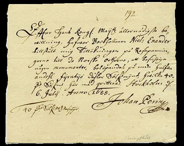 Halland, Båhuslen og i ein periode også Trøndelag til Karl XI og Sverige samt den store nordiske krigen 1700-21 der Sverige under Karl XII også prøvde å erobre resten av Noreg. Interessa for norske forhold var stigande i Sverige, både politisk og antikvarisk. Den siste grunna seg på at det kunne finnast manuskript, innskrifter, runesteinar, bygningar og andre kulturminne i Noreg som kunne opplyse den svenske historia, for i Sverige var kjeldene til den eldste historia få og spreidde. I 1688 gjorde t.d. Johann Pering, ein assistent til Hadorph, ei reise «till de Norske Ortherne, att besigtiga några monumenter», og fekk refundert 40 sølvdalar i reiseutgifter. (Fig. 3)