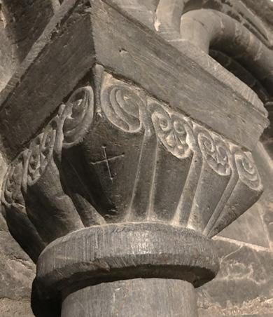Fig. 6: Overgangen i det nordaustre hjørnet av nordre tverrskip frå anglo-normannisk stil (t.h.) til ‘cisterciensar-stil’ (t.v.) med vassliljeblad. Arkivfoto 6216