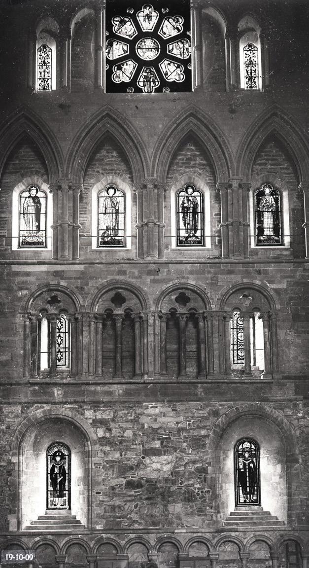 Klerestoriet i nordre tverrskip viser eit steg vidare i overgangen til gotikken. No forsvinn mellomsøylene og bogane blir breiare og høgare. (Fig. 7) Alle søylene har kapiteler med vassliljeblader. I bogane blir det også innført eit nytt dekorornament: små uthola ‘pyramider’ som er kjent som ‘hundetannsbord’ (dog-tooth). Det er svært mykje brukt i tidleg-gotisk stil i England og bruken av slik dekor varslar eit stilskifte. Dei store og spinklare bogane viser vilje og evne til å frigjere seg frå den meir solide eldre arkitekturen, og i tillegg at kunnskapen om konstruksjon av større bogar er blitt meir utvikla.