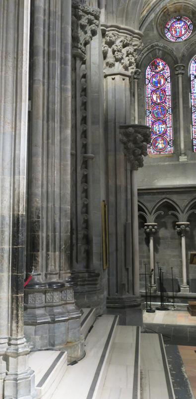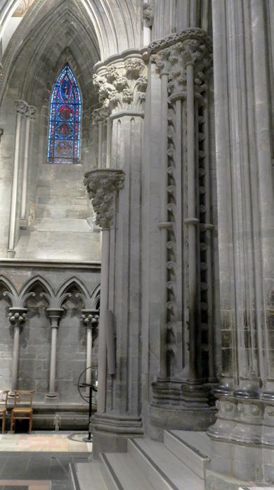 Inne i tverrskipet ser vi derimot at på triforienivået er den anglo-normanniske stilen brukt på både den ytre og indre veggen berre på austsida av nordre tverrskip. Veggen inn mot tverrskipet har ei samanhengande rekke med store, runde bogar som er delte av ei midtsøyle i to mindre bogar med ein liten sirkelforma opning over. I overgangen til triforiegangen frå austsida til nordsida endrar stilen på den indre veggen seg brått frå det eine kapitélet til det andre – frå eit anglo-normannisk foldekapitel til eit kapitél med buktande vassliljeblad (water-leaf) som krøllar seg i enden. (Fig. 6) Profilane i bogen endrar seg også, og eit stort firpass erstattar den vesle sirkelforma opningen.