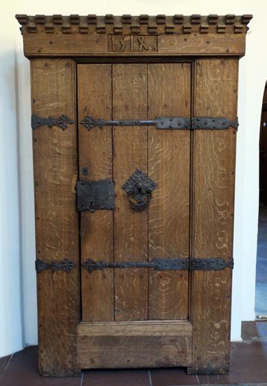 The east wall in the south transept before the restoration, with the three levels: arcade, triforium and clerestory. To the left, the bricked-up opening to the south aisle in the chancel. The door in the altar niche shows the entrance to Iver von Ahnen’s burial vault.