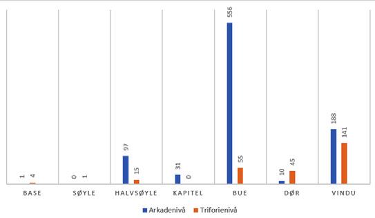 som i triforiet har søylene kapiteler med stive bladknollar, knippesøyler og hundetannsbord i bogen.