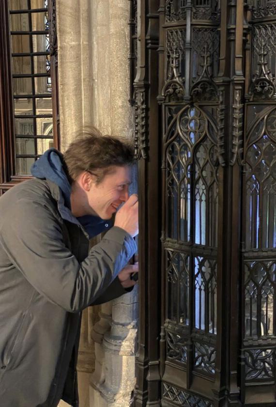8: Jens Strassegger besiktiger middelaldersk smijern i Windsor Castle med stor begeistring. Jens Strassegger inspecting medieval wrought iron work in Windsor Castle with great enthusiasm.