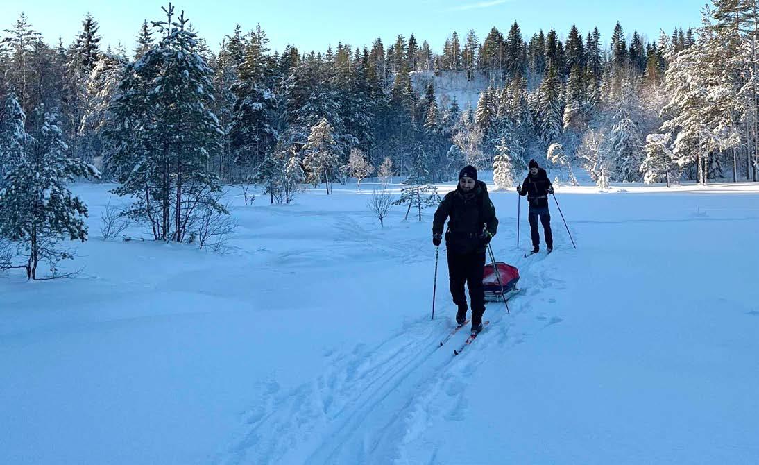 Vi surrer oss rundt vannet, drar pulken gjennom tett skog , bratte bakker og råtten snø. Tiden går, og det begynner å demre at dette ikke blir noen søndagstur. Etter to timer i villmarka føles pulken tyngre, snøen dypere og humøret en smule tynnere. Men vi holder motet oppe.