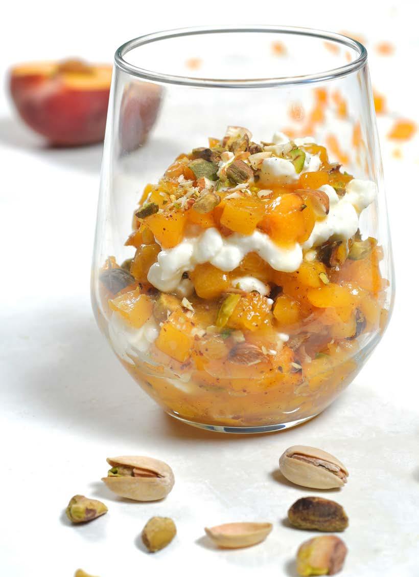 Mango, papaya, grønne og orange melonterninger, druer, fersken, ananas
