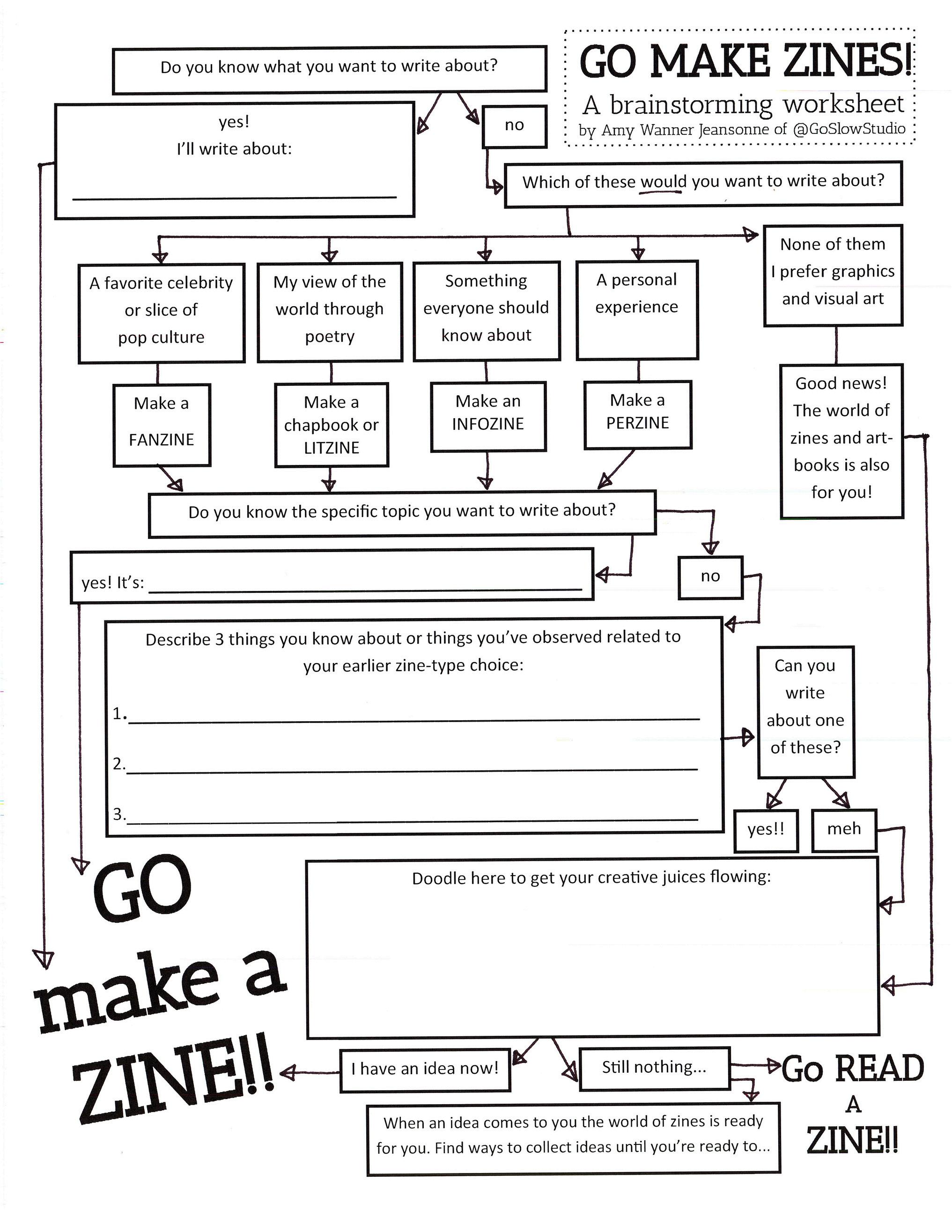 Have them complete the “Go Make Zines” worksheet by Amy Winner (see BPL Wiki for printable version)