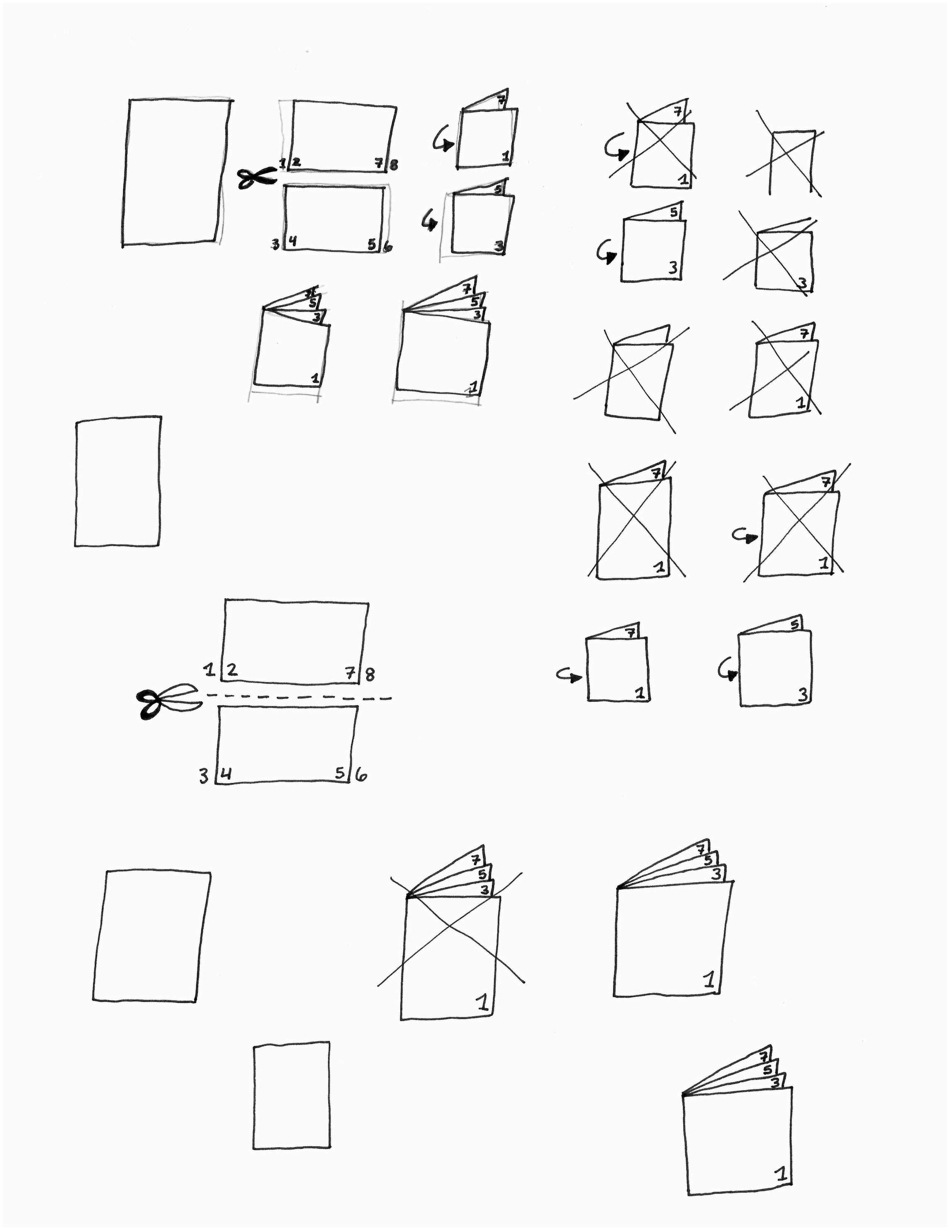 In this chapter, you will find written guides for creating common zine sizes and styles. You will find select pages from the Booklyn Education Manual and other drawings to help you visualize the steps. If you need more support check the BPL Zine Box Wiki Page for helpful videos or reach out to Emma Karin at eeriksson@bklynlibrary.org.