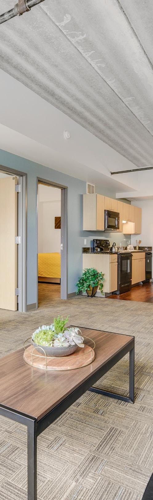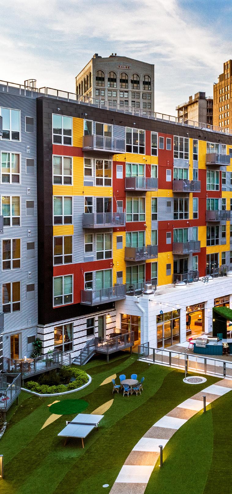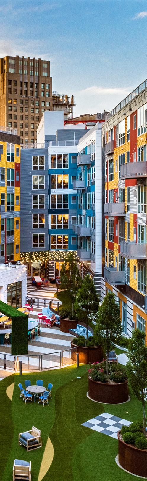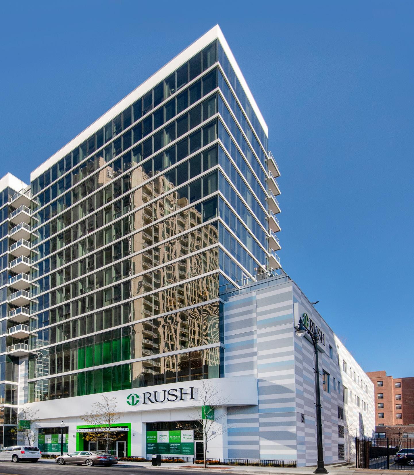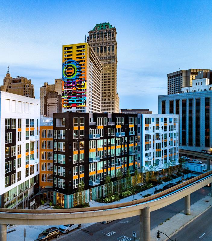 1407 on Michigan is a 270,000 SF, 15-story high-rise rental property that is built to Type 1A construction. This LEED® Silver certified project is located next to the newly restored Chicago Firehouse Restaurant and replaced a vacant office building once owned by the National Association of Letter Carriers. The tower includes 141 parking spaces on three levels and 40,000 SF of the medical office. The dog-friendly building has a mix of studios, one-, two-, and threebedroom apartments totaling 199 units. These units range from 450 SF studios to 1,700 SF, three-bedroom units. It is also designed as a contemporary upscale rental property featuring top tier unit finishes, floor-to-ceiling glass, and high-end amenities.