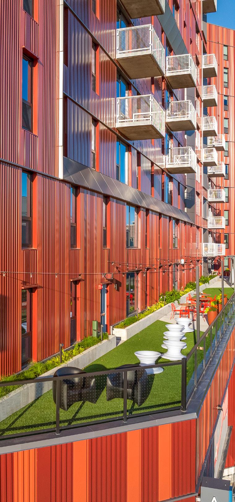 The community is a 262-unit, six-story, slab-on-grade podium building. It is made up of five levels of wood frame construction, over a podium level of 8” precast plank bearing on 8” CMU bearing walls. The site includes a freestanding parking garage, also designed by BKV Group.