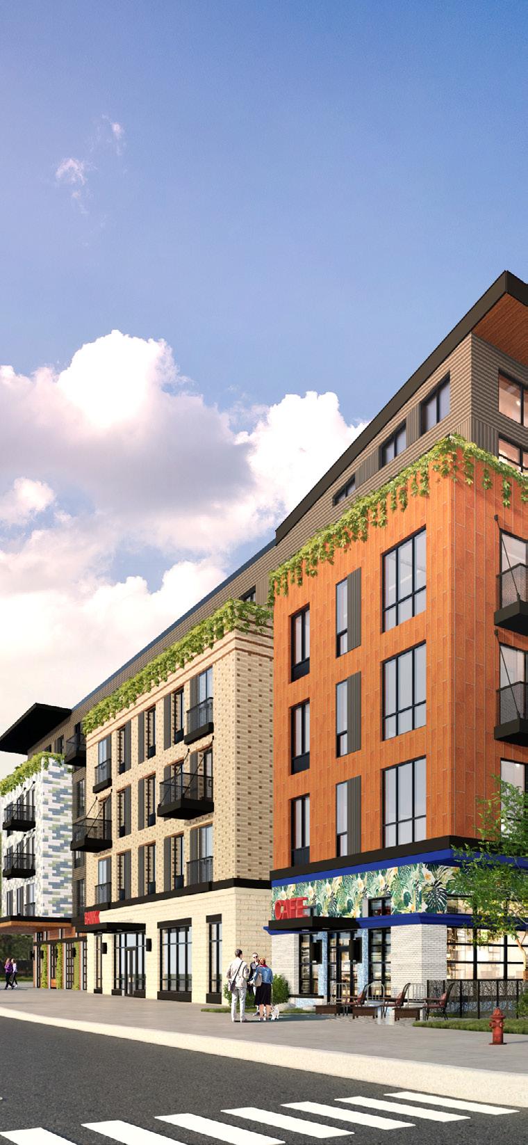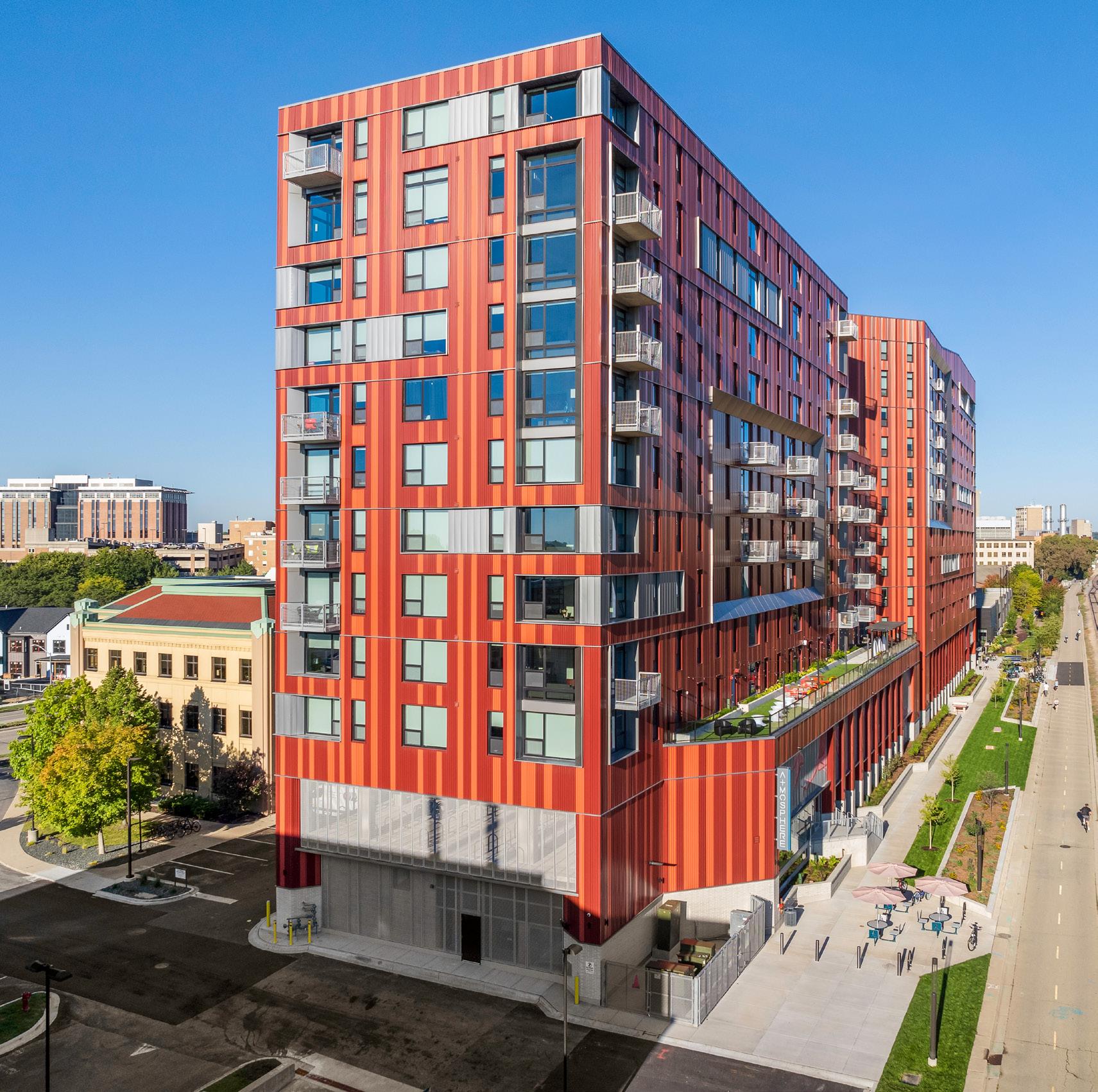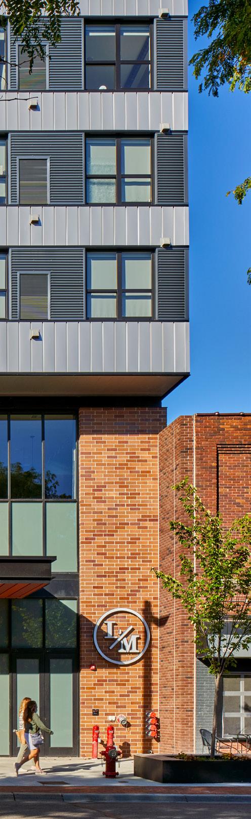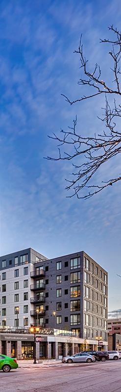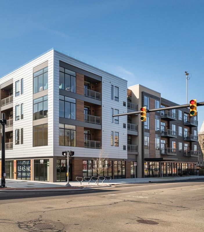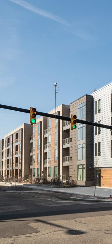 Located in downtown Kalamazoo, Michigan, this new marketrate residential development brings a contemporary approach to a traditional material and color palette. The project is pursuing LEED for Homes certification and consists of a four-story wood structure containing 135 units totaling 169,329 SF. Residential units range from studios to 2-bedroom apartments, with first floor units activating the streetscape with direct entrances to each unit.