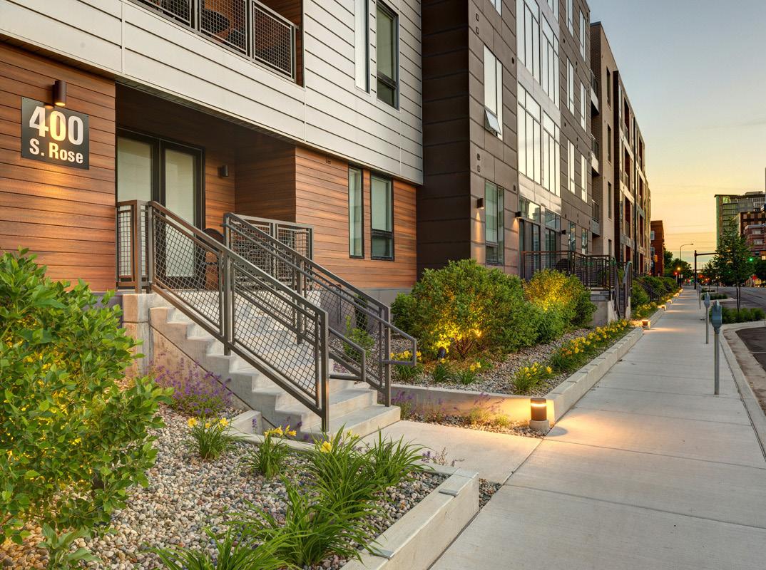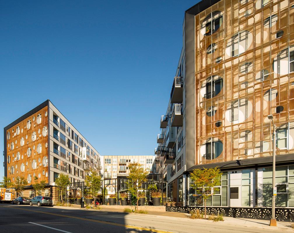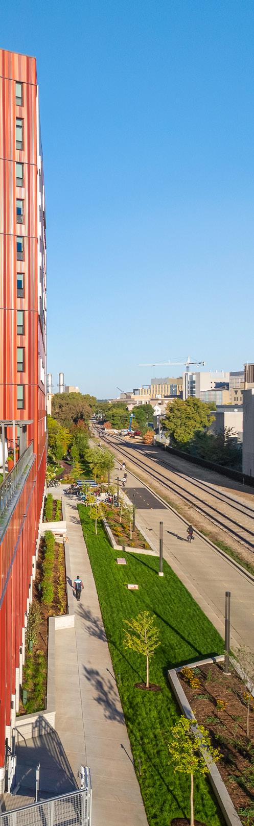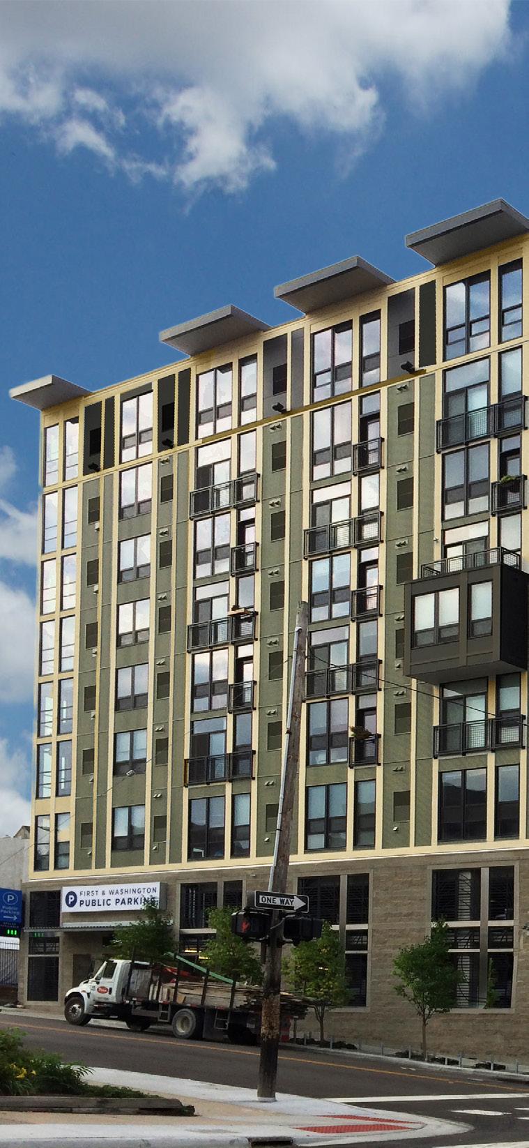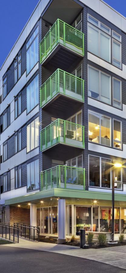Located in downtown Kalamazoo, Michigan, this new marketrate residential development brings a contemporary approach to a traditional material and color palette. The project is pursuing LEED for Homes certification and consists of a four-story wood structure containing 135 units totaling 169,329 SF. Residential units range from studios to 2-bedroom apartments, with first floor units activating the streetscape with direct entrances to each unit.