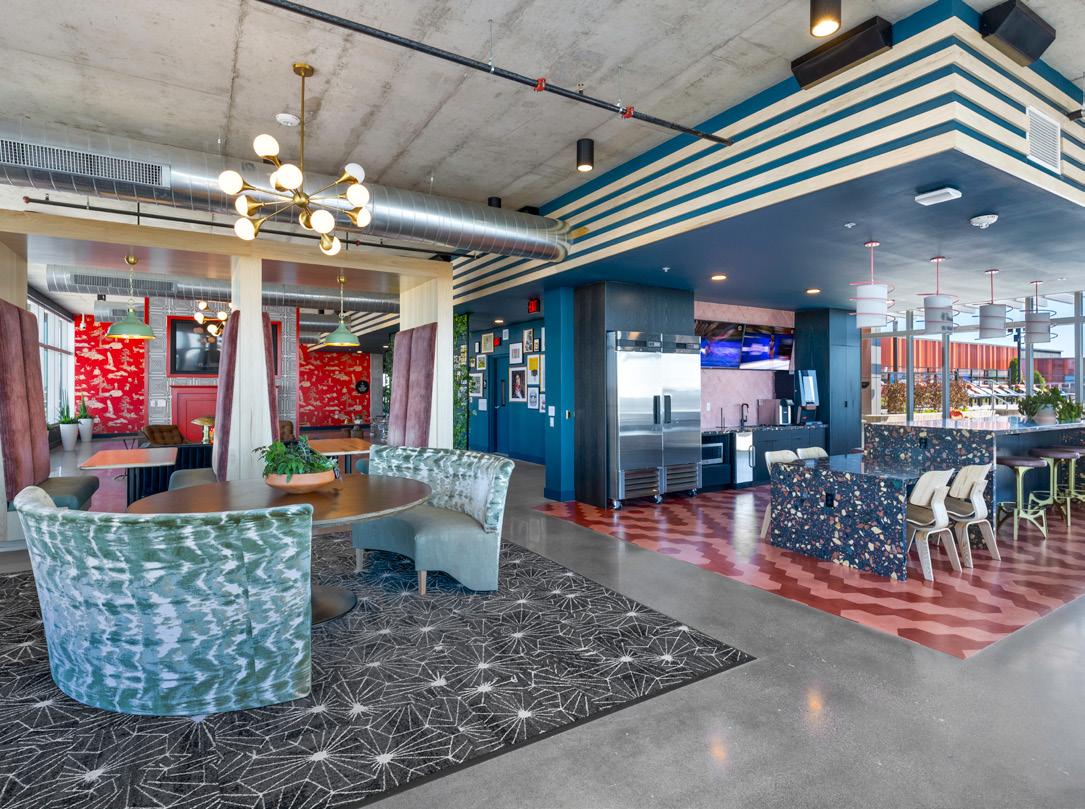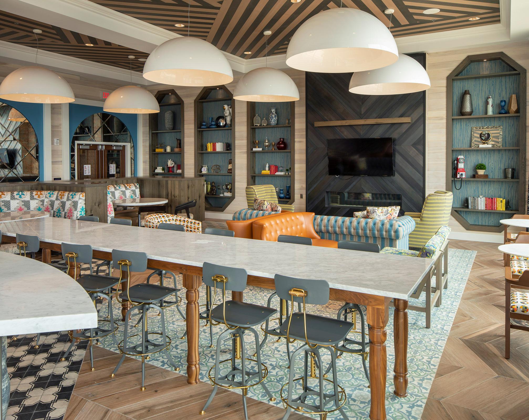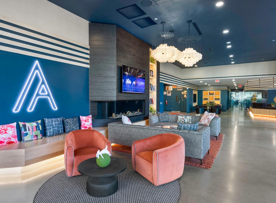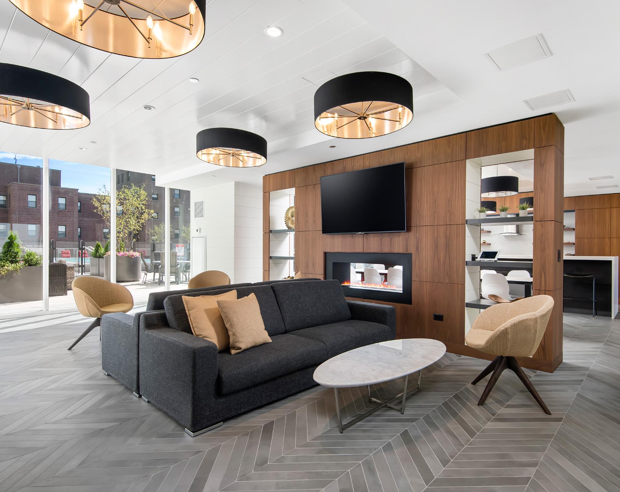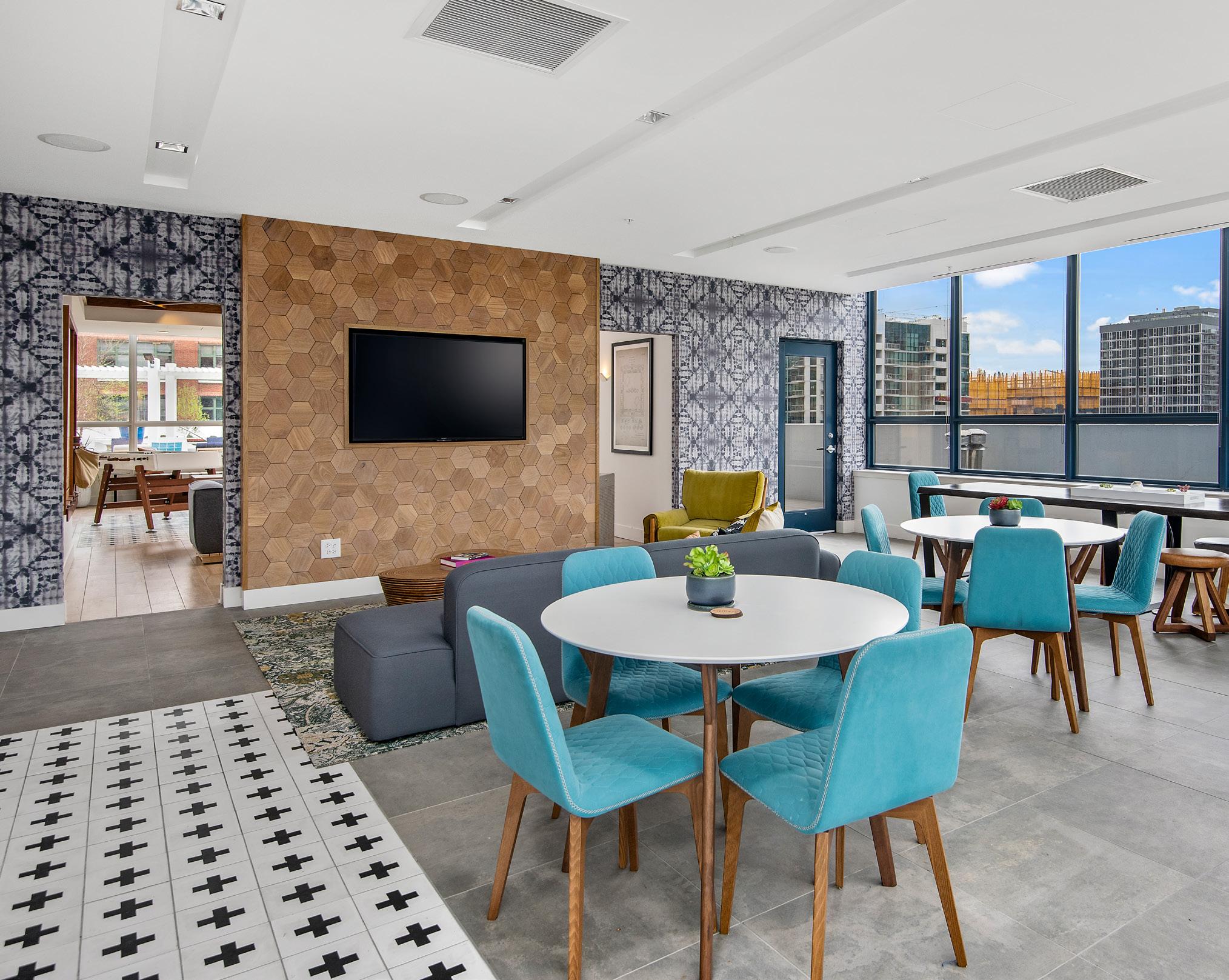 Throughout the fifth-floor amenity spaces, a warm wood-tone floor is contrasted with graphic elements and accents of color. In the party room, a floral rug and rich walnut wood tones are juxtaposed with graphic black and white concrete tiles on both the floor and wall that will endure a beautiful patina over time. This same black and white floor tile is a repeating element in the game room where residents can enjoy a variety of games including billiards, board games, and a giant wall Scrabble game. A colorful, abstract watercolor graphic draws residents to the fireplace lounge and out to the newly outfitted roof deck.