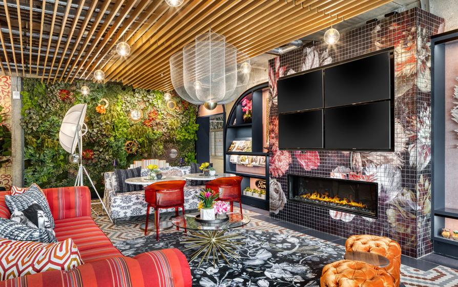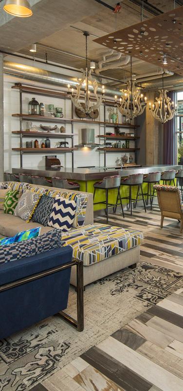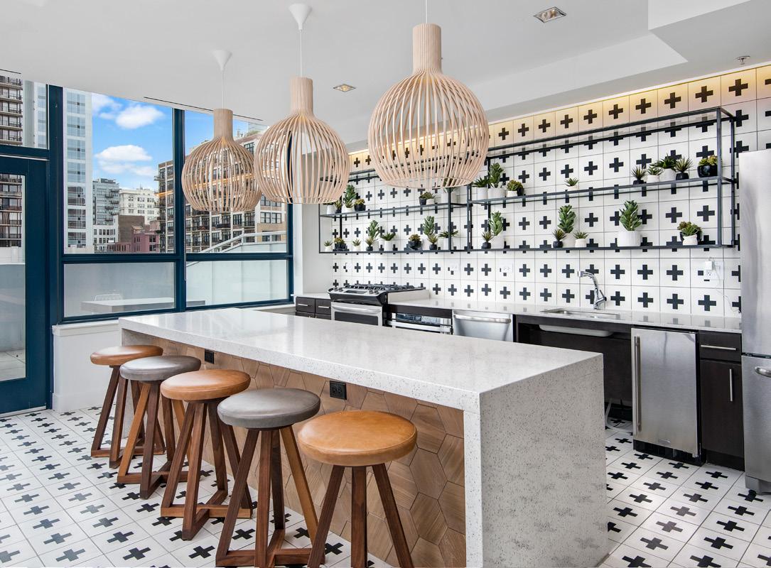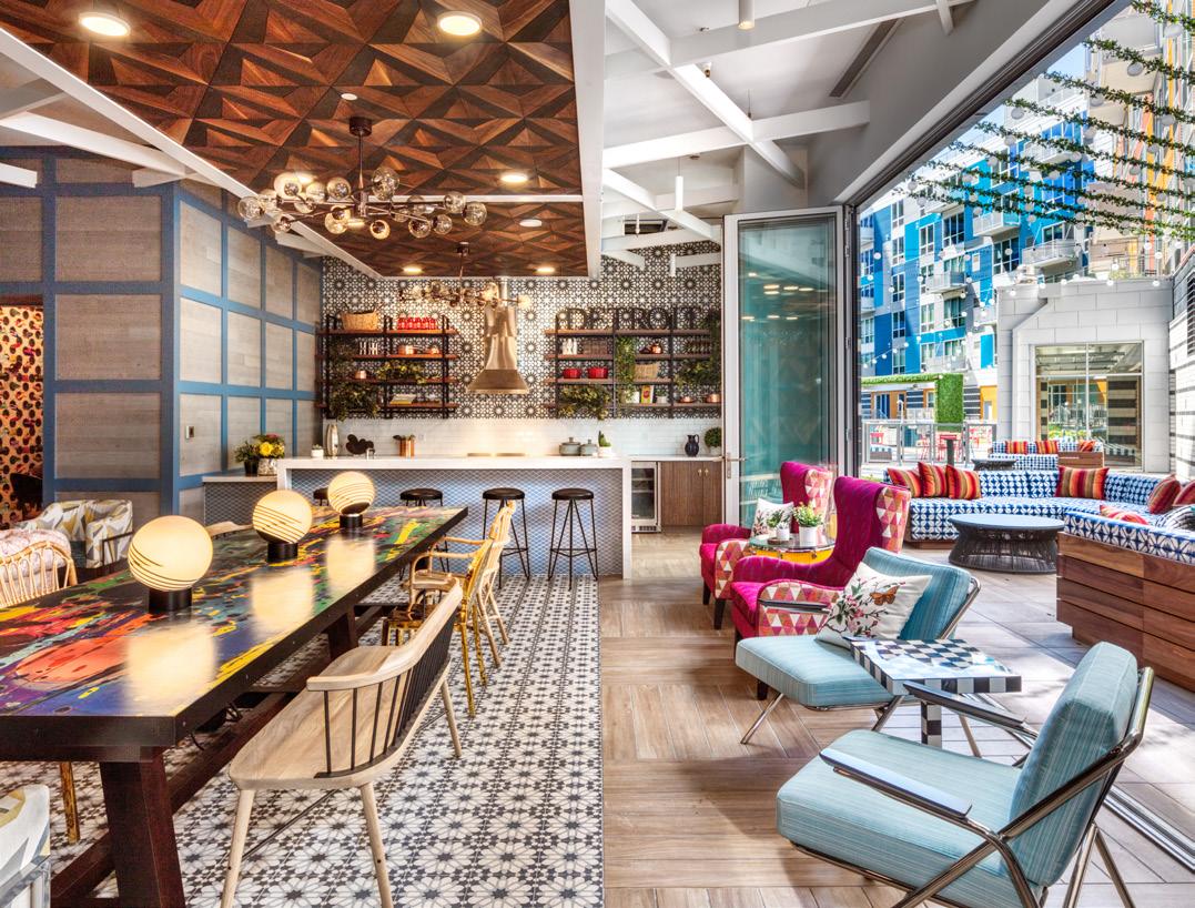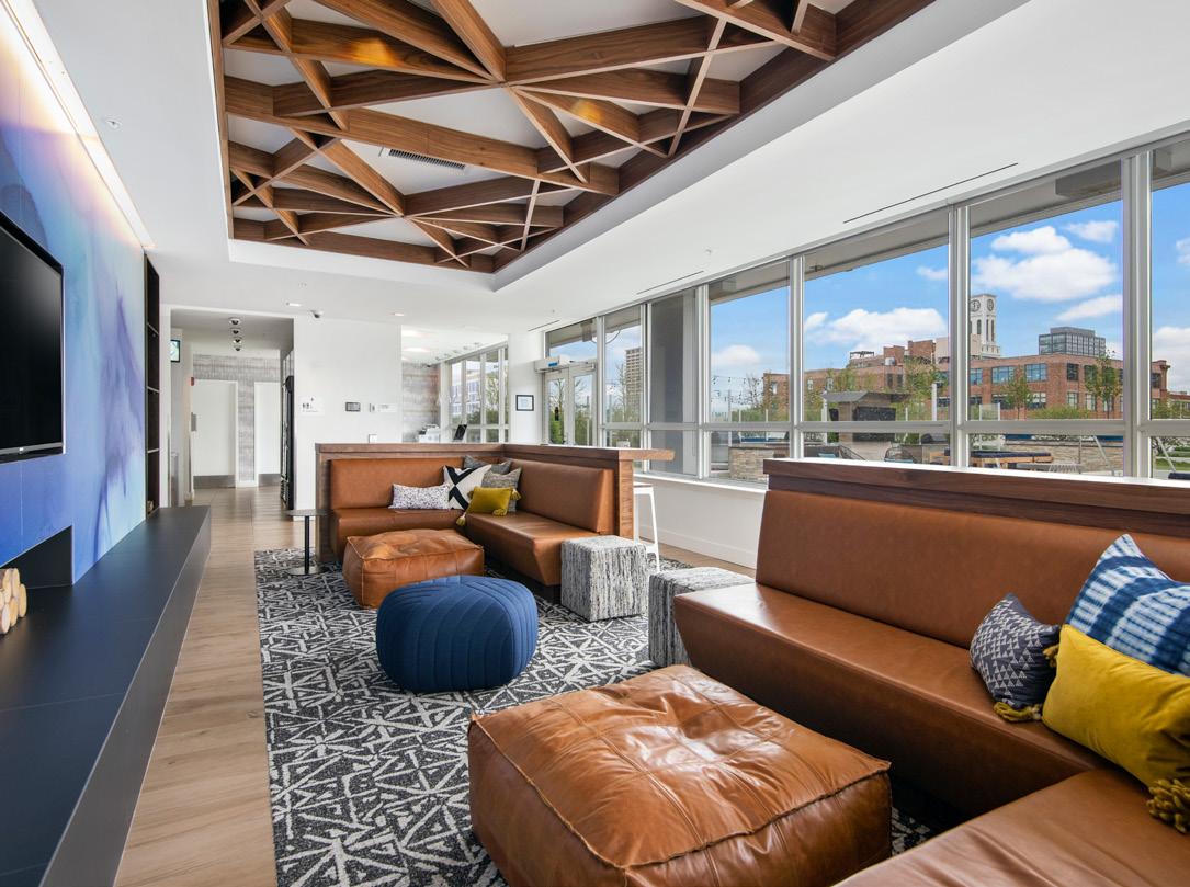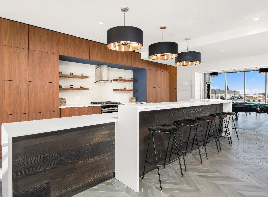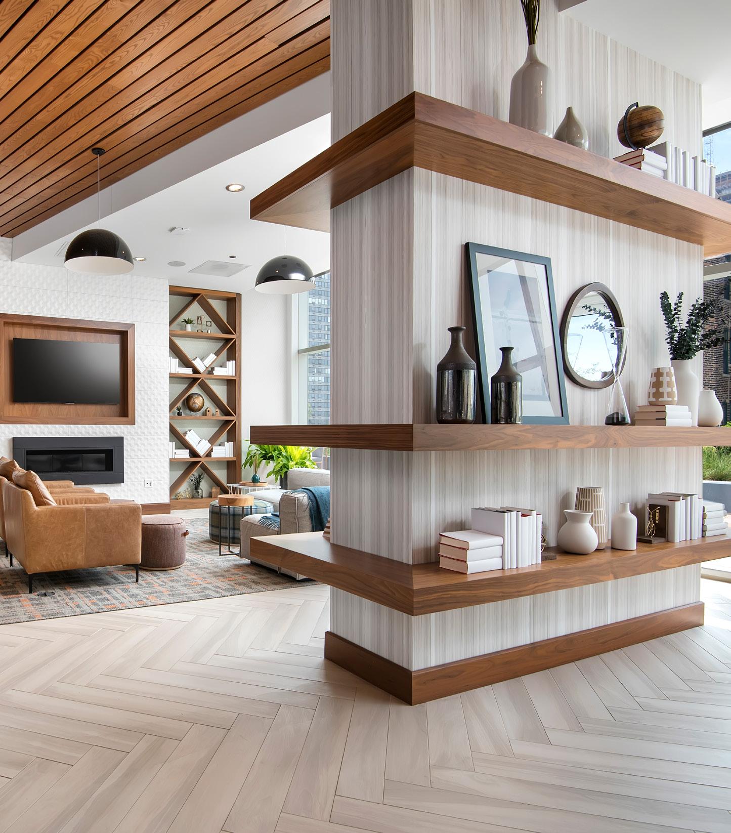 Throughout the fifth-floor amenity spaces, a warm wood-tone floor is contrasted with graphic elements and accents of color. In the party room, a floral rug and rich walnut wood tones are juxtaposed with graphic black and white concrete tiles on both the floor and wall that will endure a beautiful patina over time. This same black and white floor tile is a repeating element in the game room where residents can enjoy a variety of games including billiards, board games, and a giant wall Scrabble game. A colorful, abstract watercolor graphic draws residents to the fireplace lounge and out to the newly outfitted roof deck.