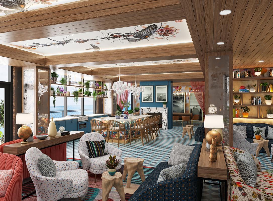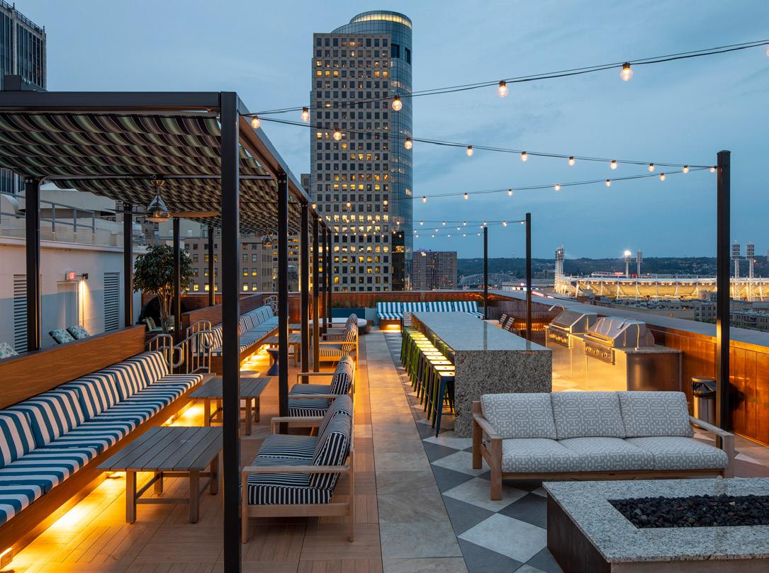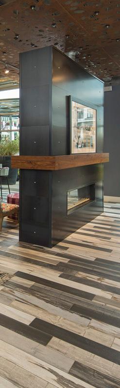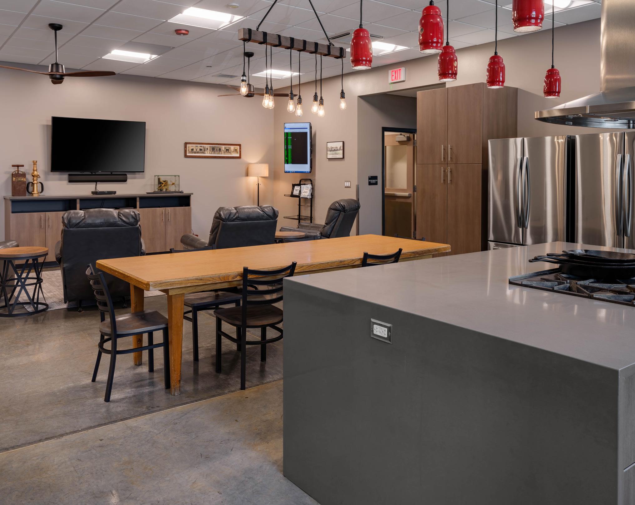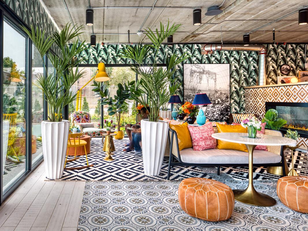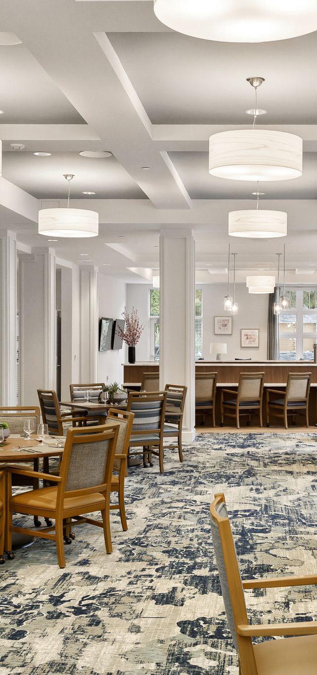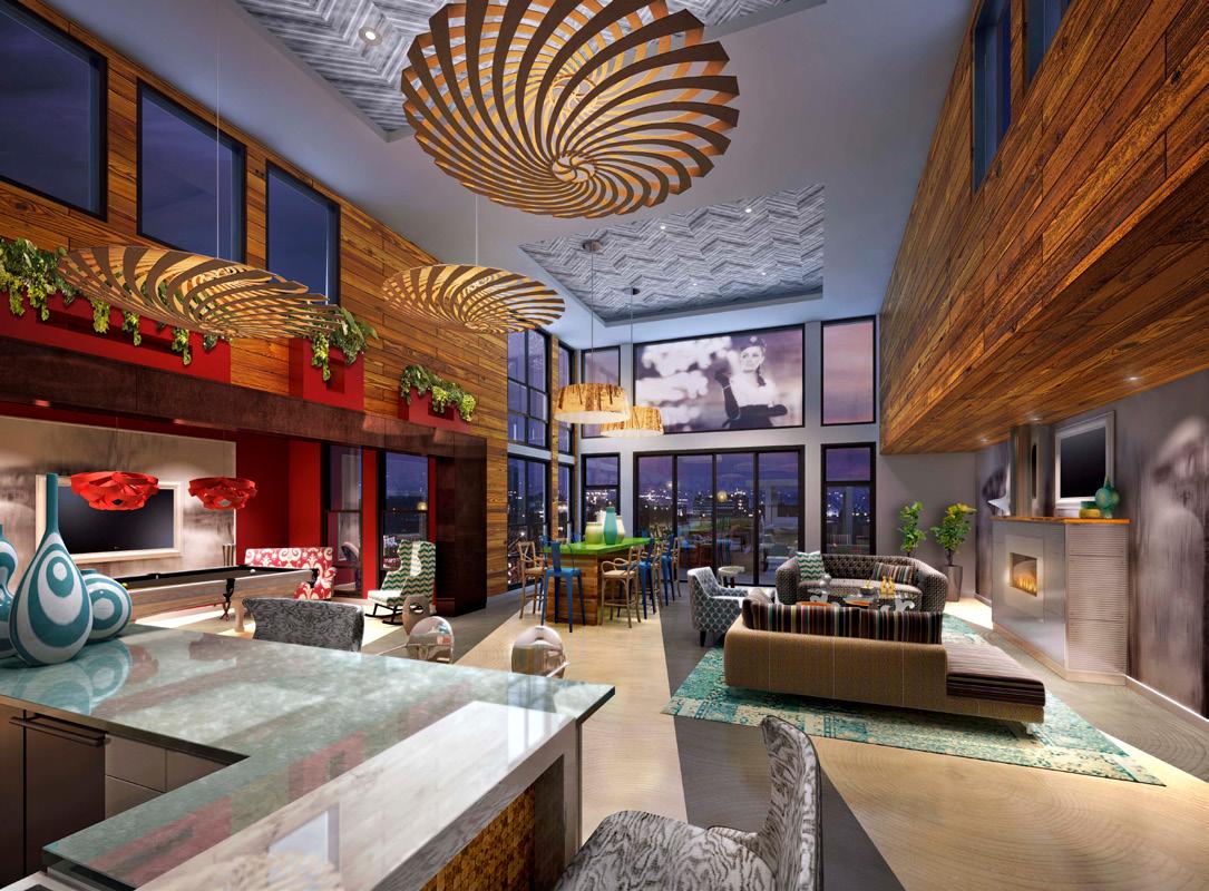 Throughout the fifth-floor amenity spaces, a warm wood-tone floor is contrasted with graphic elements and accents of color. In the party room, a floral rug and rich walnut wood tones are juxtaposed with graphic black and white concrete tiles on both the floor and wall that will endure a beautiful patina over time. This same black and white floor tile is a repeating element in the game room where residents can enjoy a variety of games including billiards, board games, and a giant wall Scrabble game. A colorful, abstract watercolor graphic draws residents to the fireplace lounge and out to the newly outfitted roof deck.