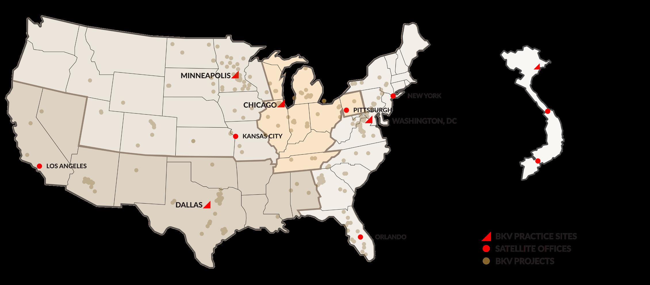 Collaborating regionally between our practice sites and satellite offices, BKV Group operates as a cohesive firm to deliver a wide range of project types for a diverse set of national and local clients. We leverage industry-leading communication and technology tools with best-in-class design processes to seamlessly work across the country to meet our clients’ needs, and continually expand our presence into existing and new markets.