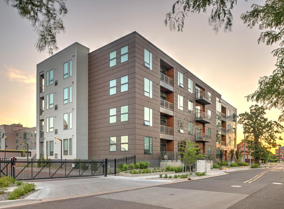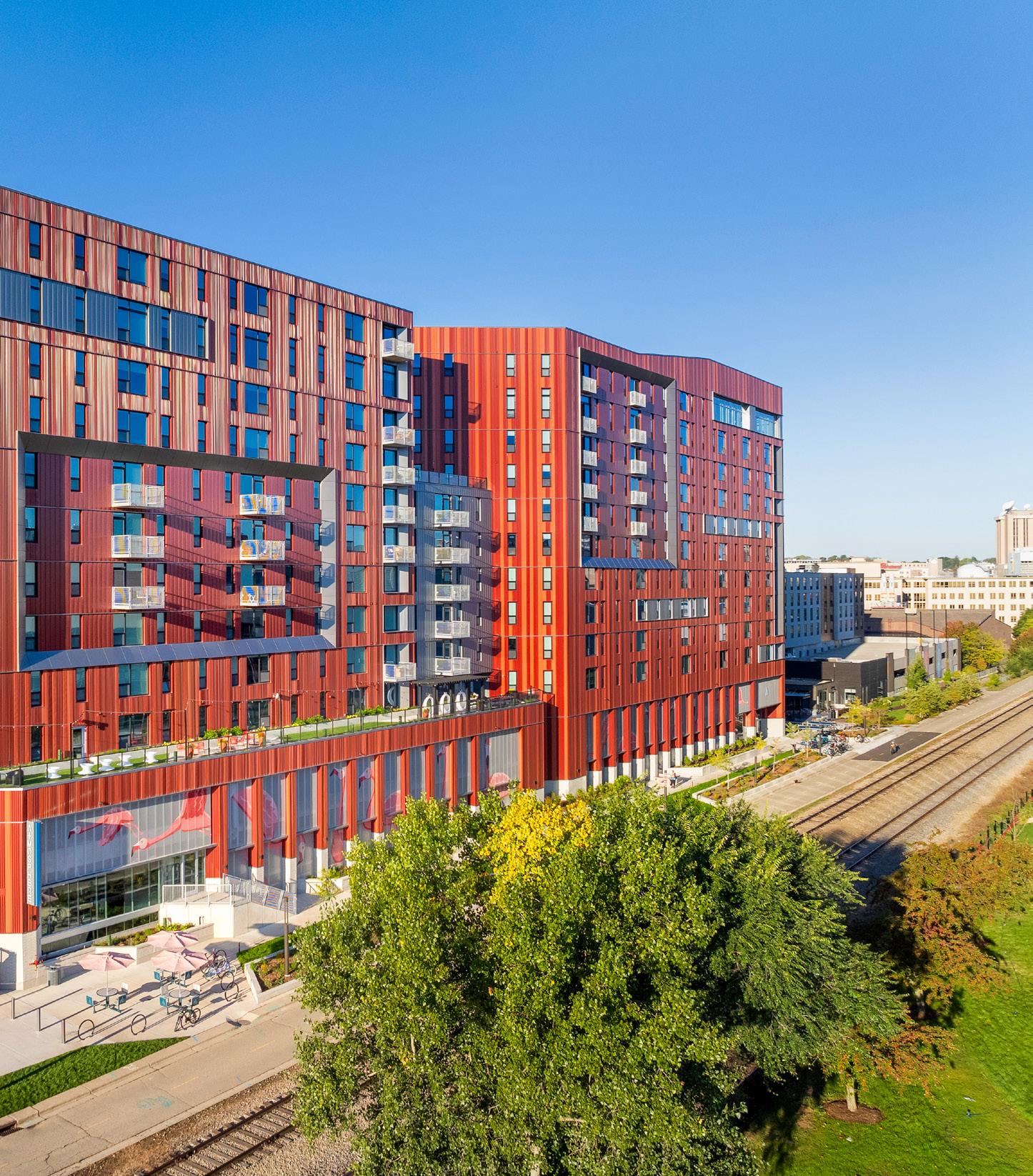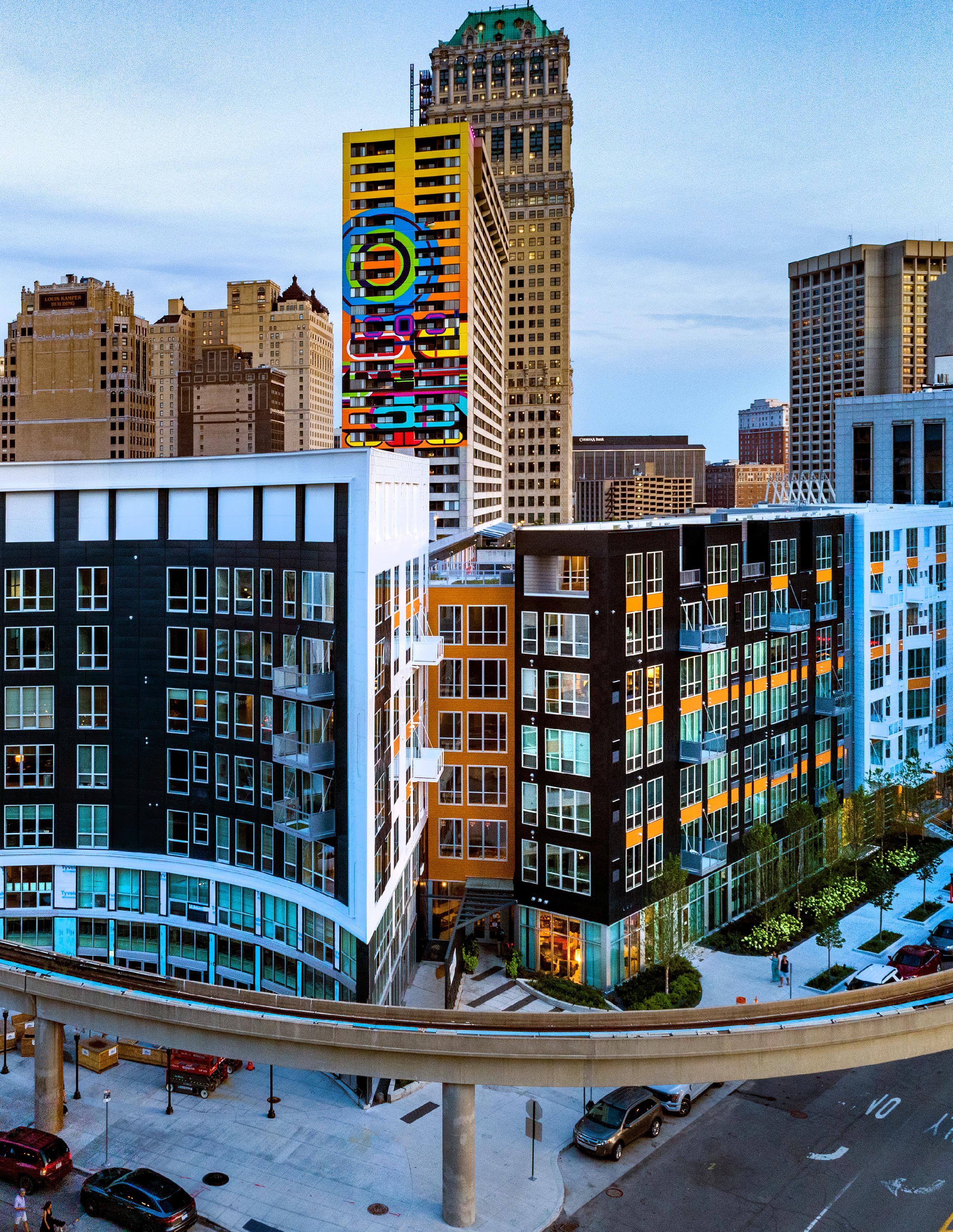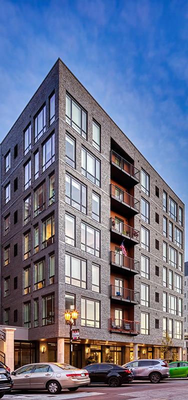 This sustainable, NAHB Green-certified development rises seven stories and includes 156 residential units, leasing offices, and amenity spaces. Residents enjoy access to a green courtyard terrace, a rooftop clubroom, and a skypark with sweeping views of downtown. The housing component sits above a new, four-level cast-in-place concrete municipal parking podium that provides 244 public stalls on a sloped 0.57-acre site.