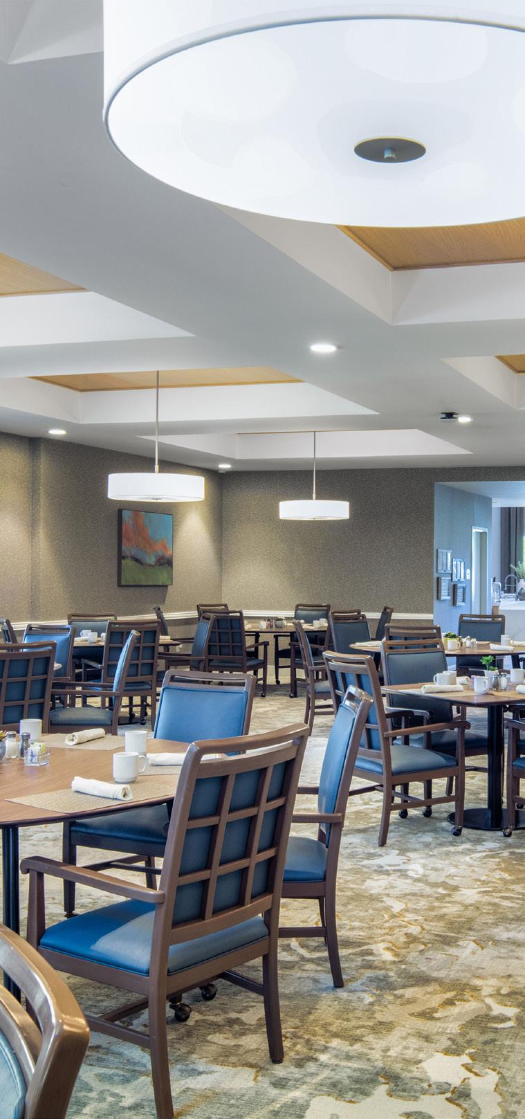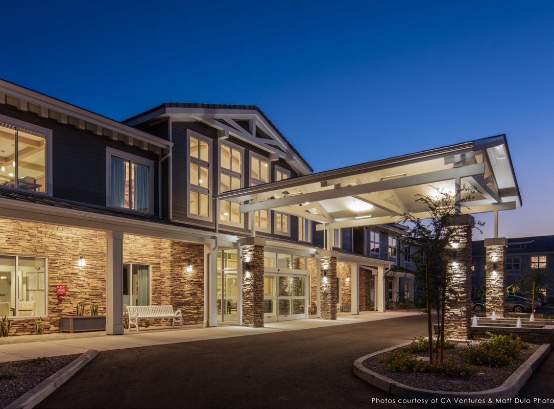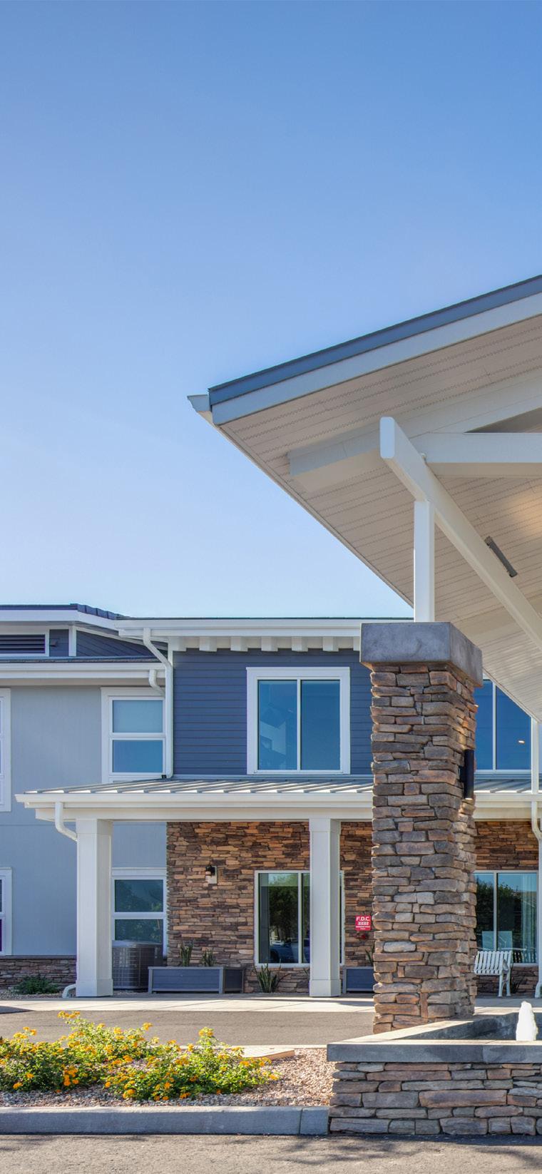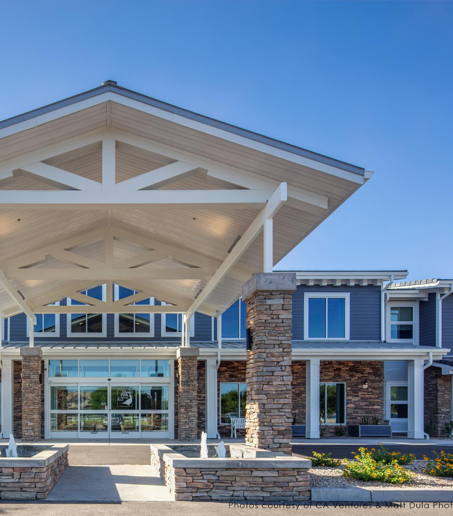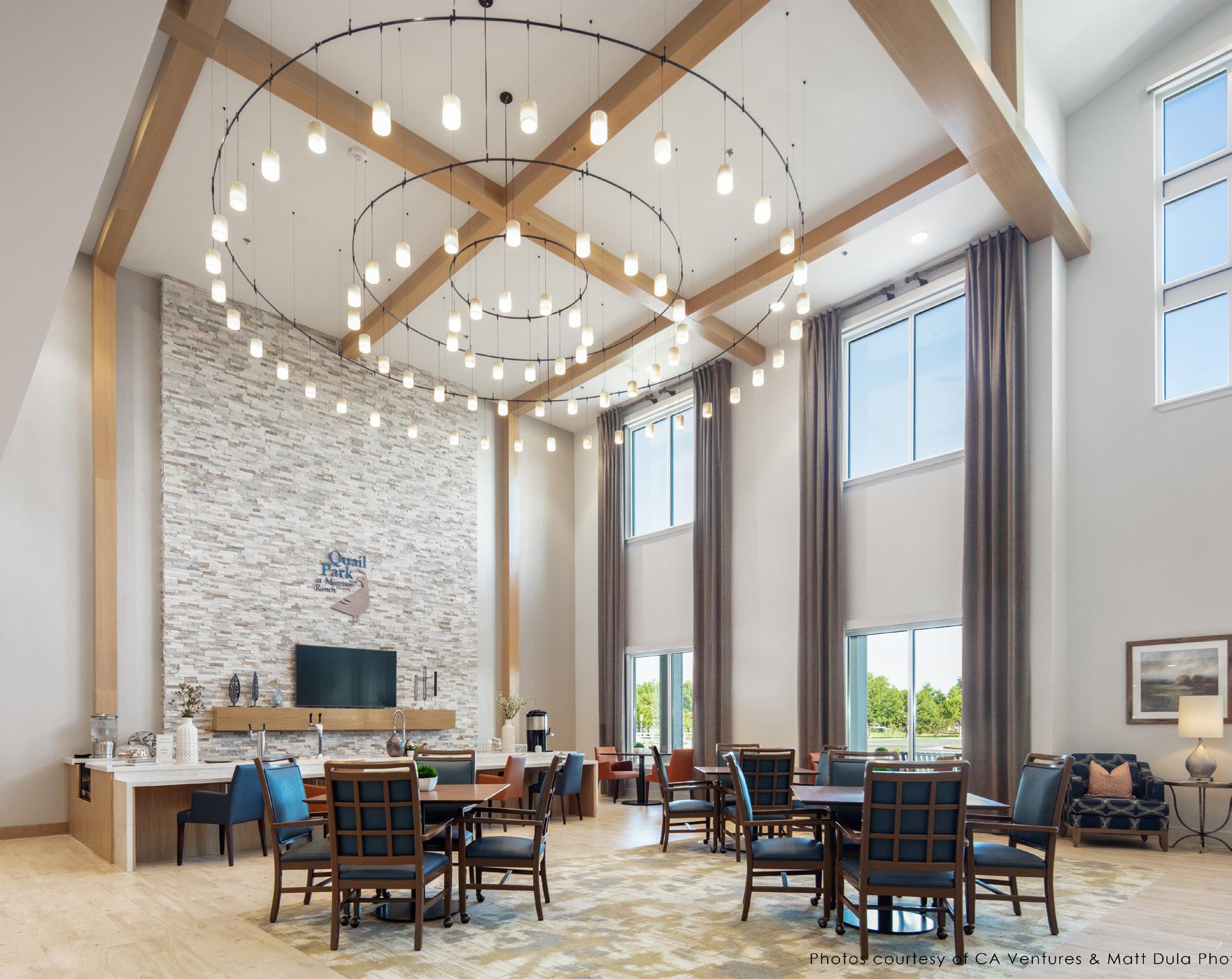 The architecture is inspired by the regional context with Quail Park expressing the look and feel of a large ranch home. The building entry is clearly identified by the porte-cochere and centralized entry, with the site featuring well-appointed landscaping such as fountains, walking paths, and shade structures.