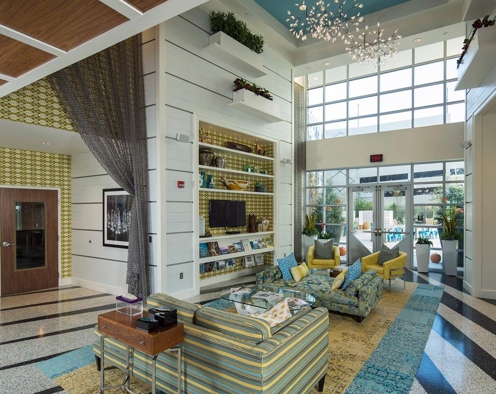 Amenities include a boutique hotel-style lobby and clubroom, concierge and leasing, fitness center, and indoor pool. Residents will also enjoy a beautiful outdoor courtyard with bar, firepit, cabanas, water features, movie wall and ampitheatre, and zen garden. The building is an NAHB Green Building.