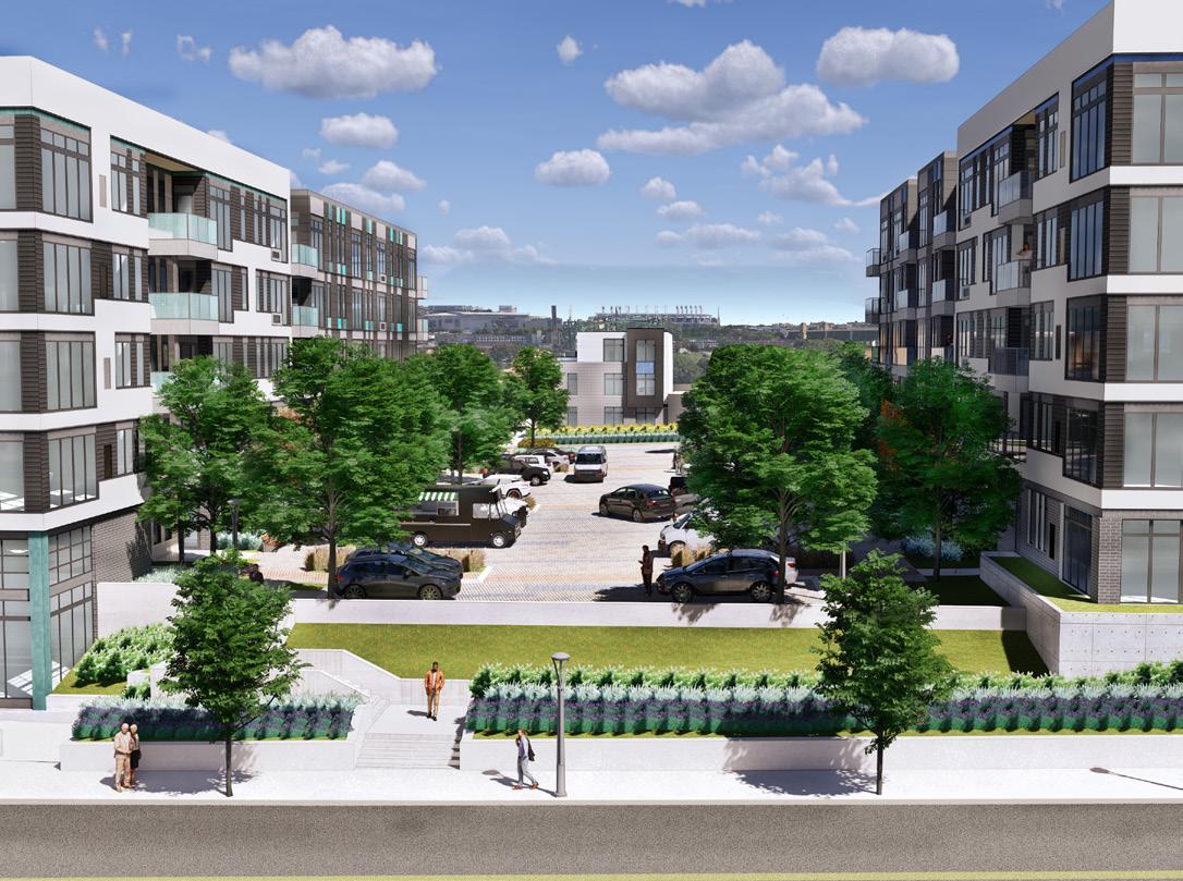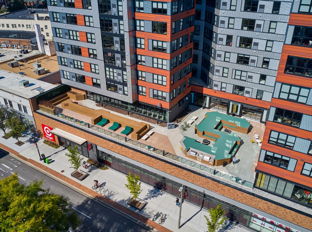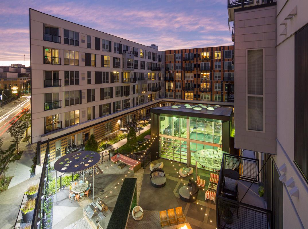 Courtyard-style residential building maximizing outdoor amenities and active street presence.