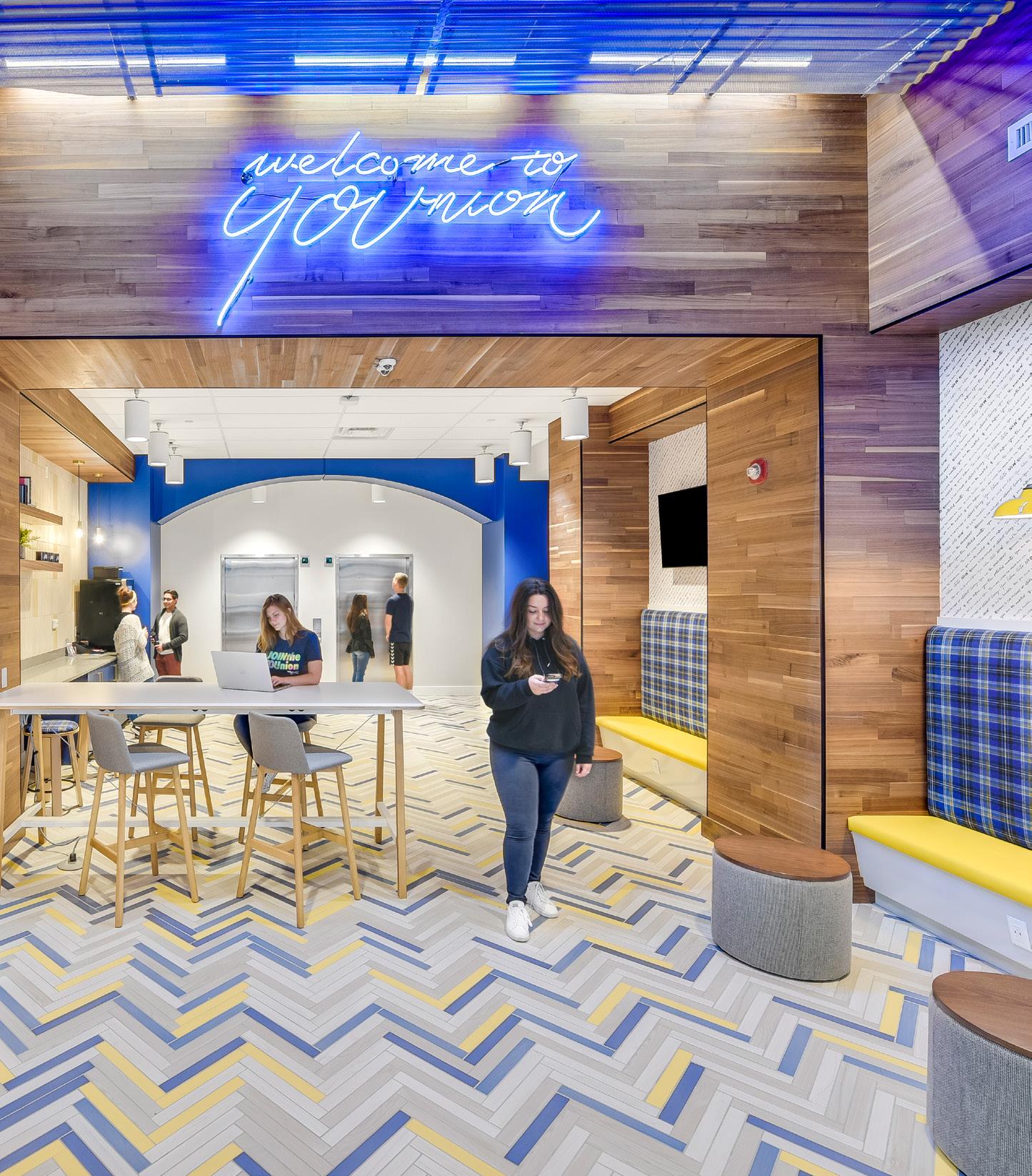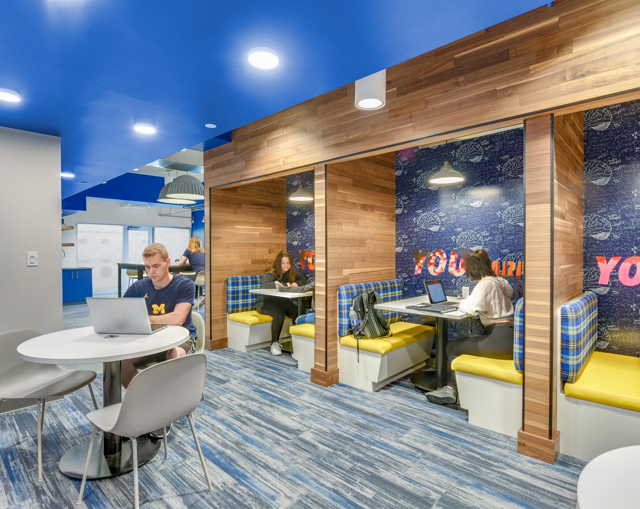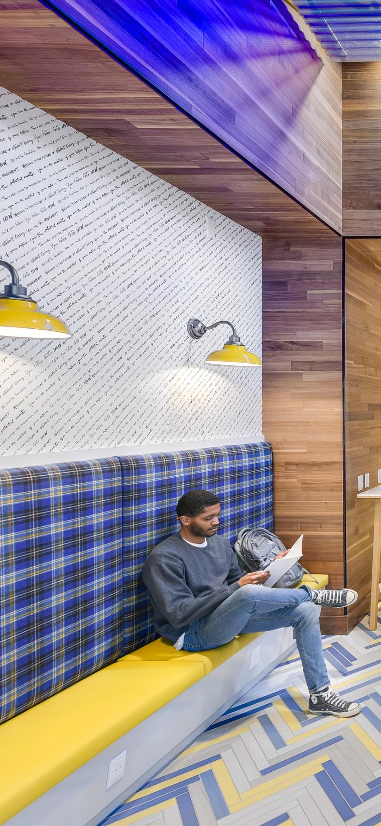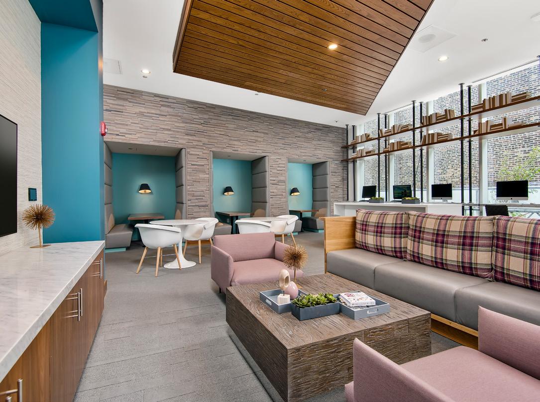 The streetscape was activated by adding a new fitness center at grade which provides another new window into the Younioun property for pedestrians. A 10th floor clubroom and fitness space has been transformed into a flexible study lounge which accommodates single students to larger groups. Booth seating, communal tables and varied lounge groupings draw students 24/7.