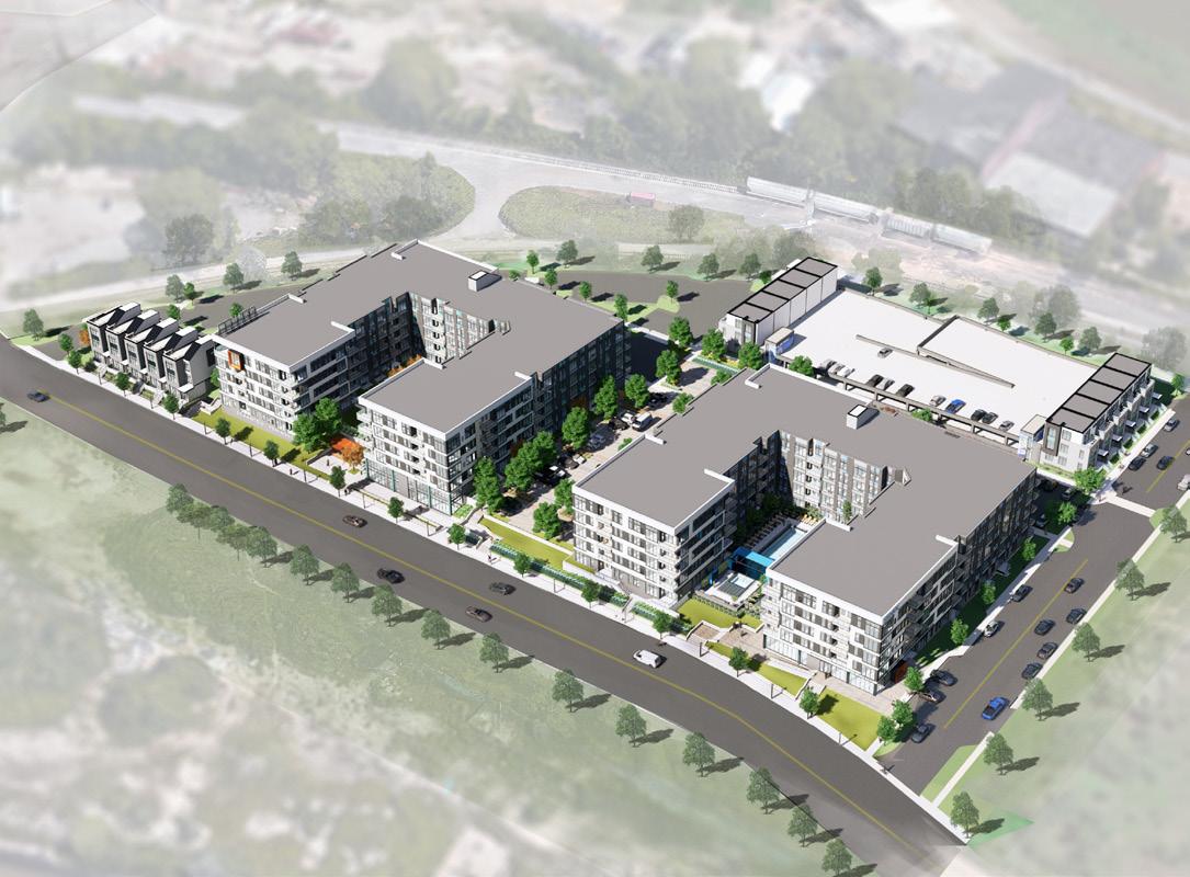 The development includes 210 residential units within a podium structure of five stories of wood-frame construction over one level of precast concrete. Two levels of underground precast parking provide 177 stalls, supported by a perimeter secant foundation system.