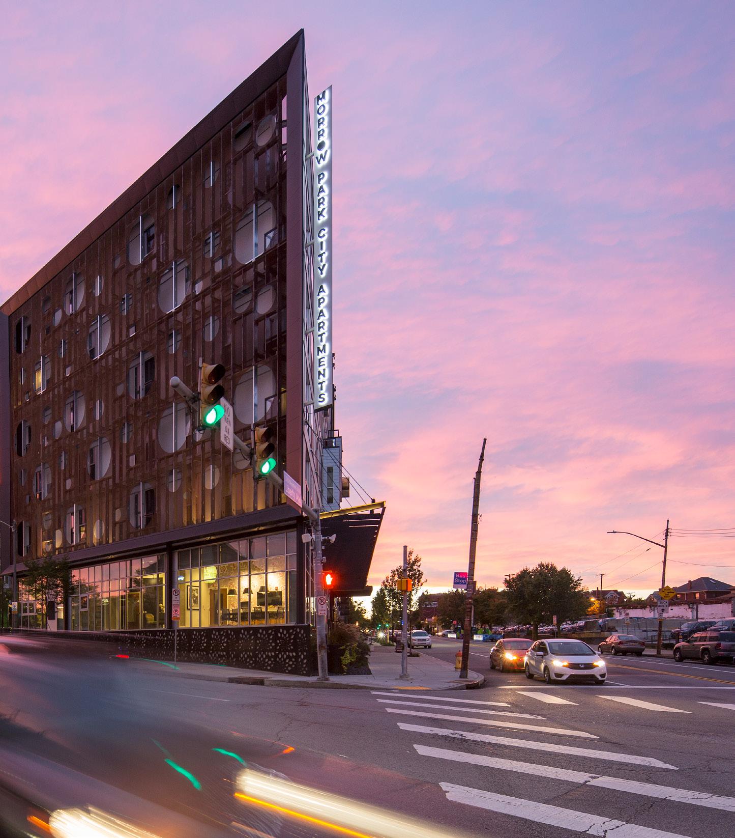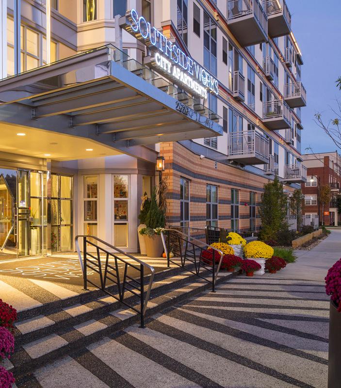 Morrow Park City Apartments is located in Pittsburgh’s Bloomfield neighborhood on the site of a former auto dealership. The six-story, U-shaped building centers around a landscaped courtyard, with a modern design inspired by the mosaic of Pittsburgh’s neighborhoods—particularly Bloomfield’s blend of shops, distinctive homes, and churches, as well as its proximity to the historic automobile row and its legacy of craftsmanship and machinery.