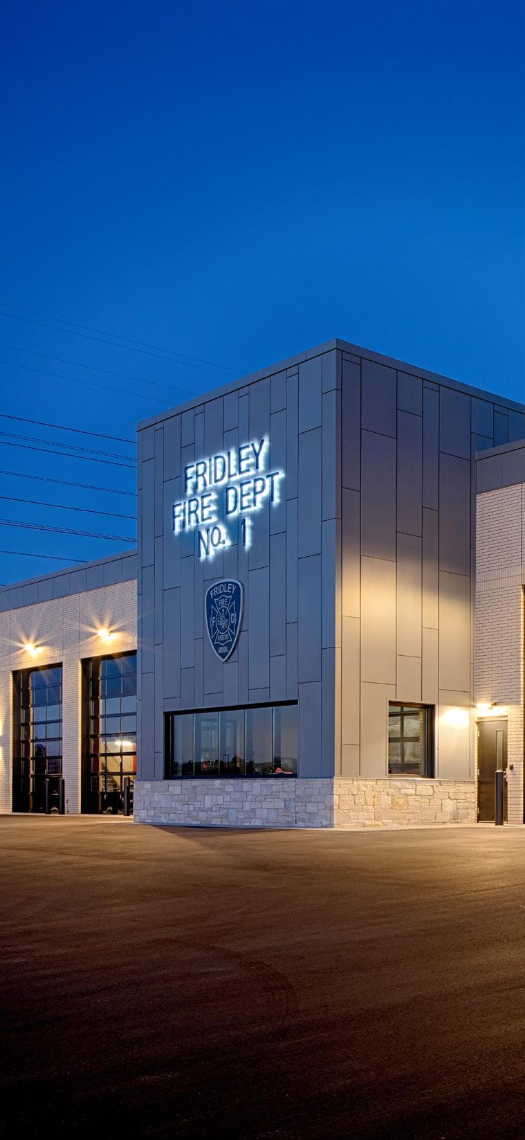 Across University Avenue from the City of Fridley’s Community Park, and directly west of the wooded trails of Locke Park and Rice Creek, stands the recently completed Fridley Civic Campus. It features a new Fire Station, Police Station, City Hall, Public Works, organized around a central water feature and shared plaza. The building’s design responds to its urban and natural surroundings with a palate of materials that are both elemental and durable.