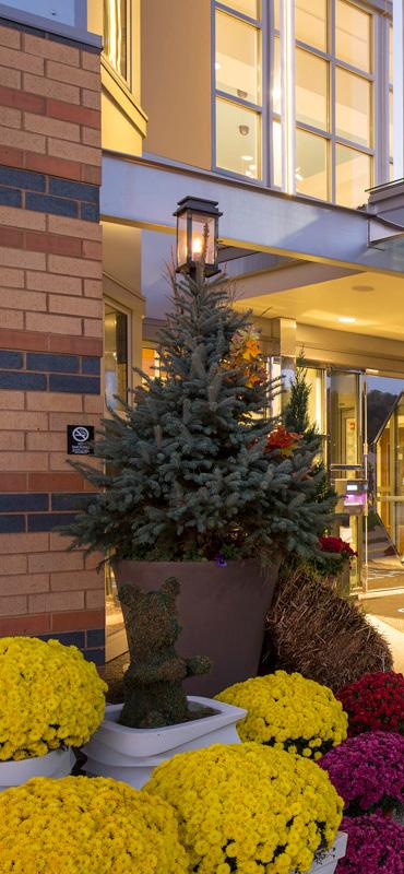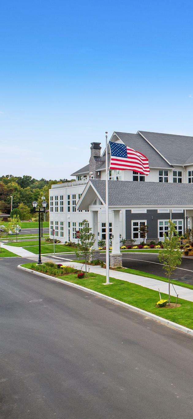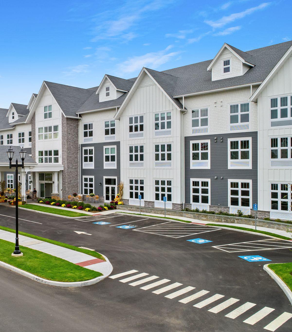 The three story building is defined by its expressed bays and large steep gables. Additionally, the building features a prominent point of entry and porte cochere, white trimmed bays filled with glass at the dining rooms and at the front of the building, cast stone chimneys, a large outdoor courtyard to the west, and a memory care enclosed courtyard to the north. The white bay on the northeast of the building provides residents outdoor access at level 3 for views of the mountain, Heublein Tower, and the Farmington River.
