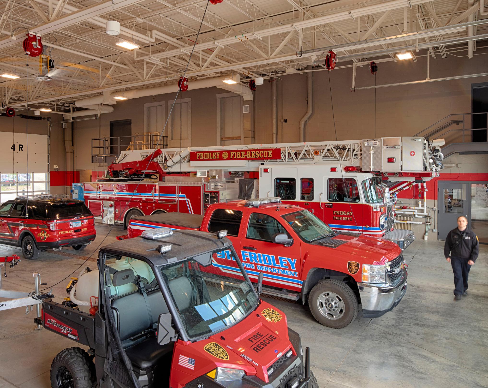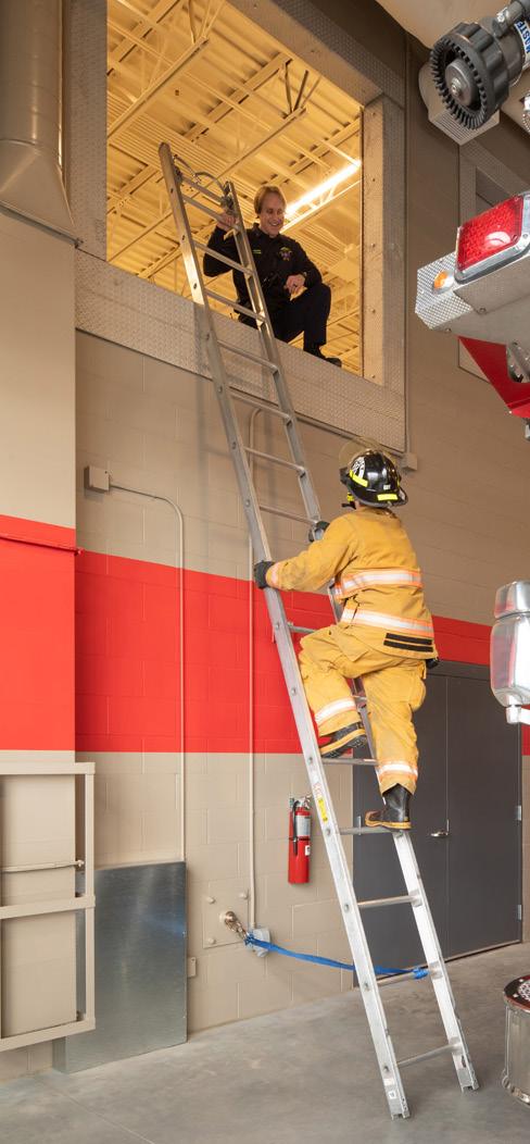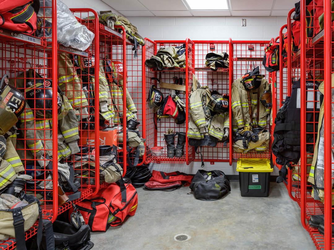 The fire station has administrative offices on the first floor and bunk rooms, a kitchen, and a dayroom for duty crews on the second floor. A fire pole provides direct access to the apparatus bays. There are dual three-bay drive-through apparatus rooms. In between these bays is the watch room and other apparatus bay support spaces. Above the support functions is a large room for mazes and props to provide on-site training opportunities.
