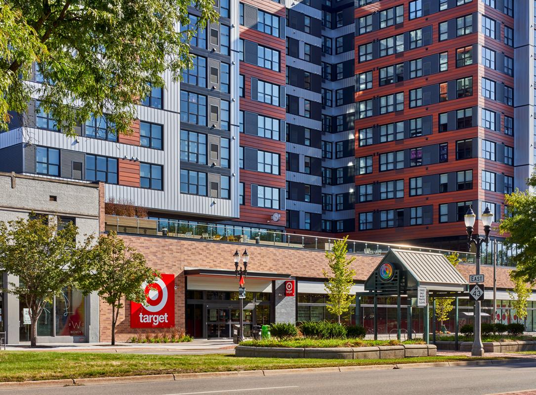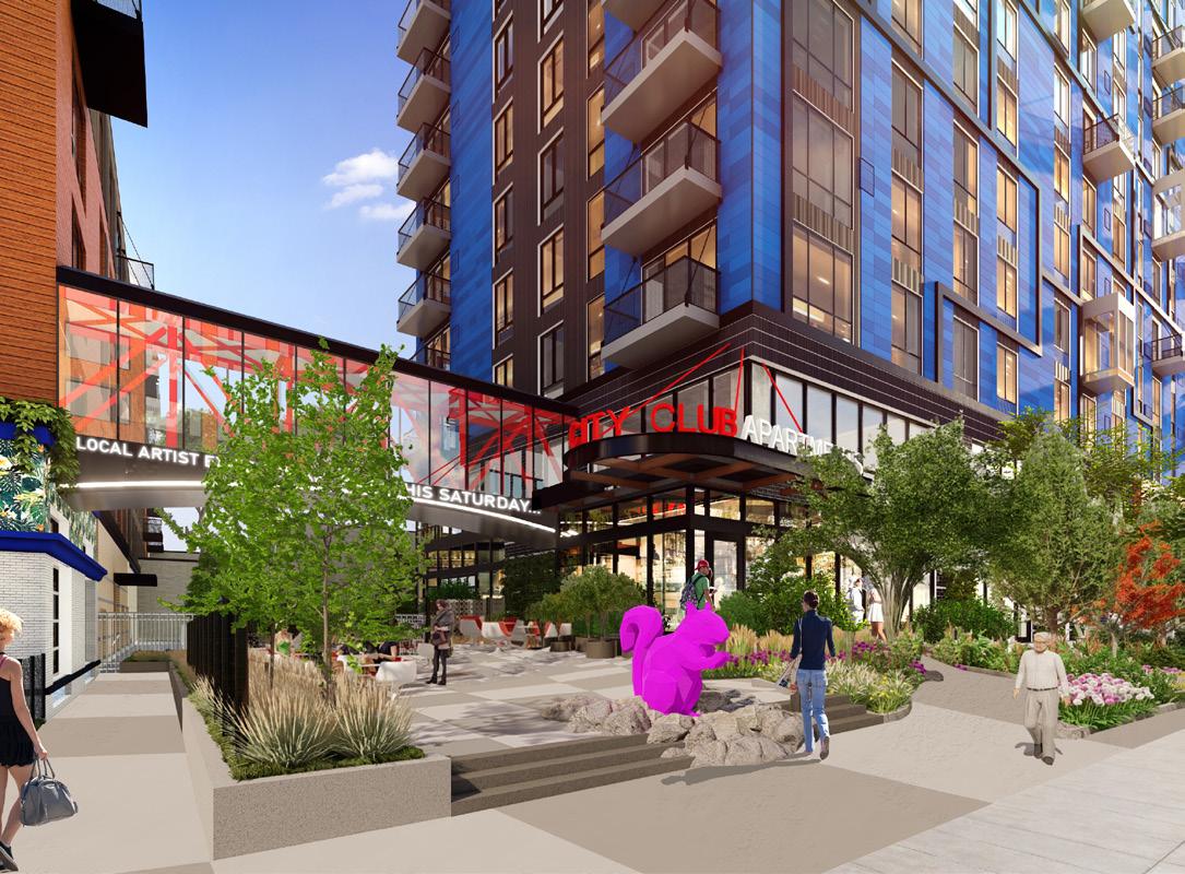 Located across from the Michigan State University campus in downtown East Lansing, East Lansing Apartments consist of two individual rental apartment towers, one for students and one for active adults, both at market rate rental. With 96 active adult apartments, 289 market rate student apartments and amenities including landscaped courtyards, a pool, fitness center, conference and meeting facilities as well as a dedicated dog run, the towers accommodate all residents. The ground floor is proposed as retail space and the street will be converted to a curbless “complete street” to accommodate the existing festivals that are held on the surface lot to create a flexible, active and diverse pedestrian corridor.