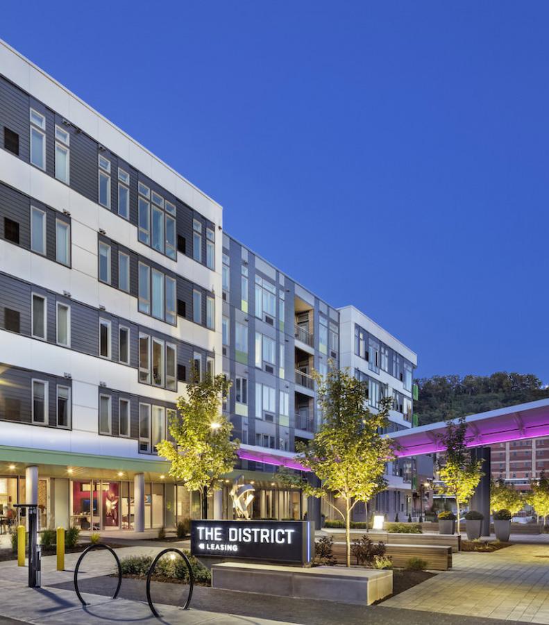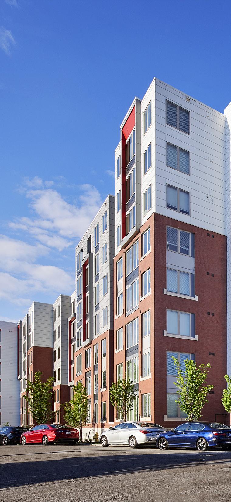 Located along the Allegheny River in Pittsburgh, The District Apartments is a vibrant two-phase residential development that brings contemporary living to the city’s riverfront. Phase II encompasses two buildings - Bridge and Middle - totaling over 647,000 square feet. Bridge is a six-story, 178-unit structure wrapped around a 544-space pre-cast parking garage, while Middle is a five-story, 264-unit building centered around a resort-style pool and landscaped courtyard.