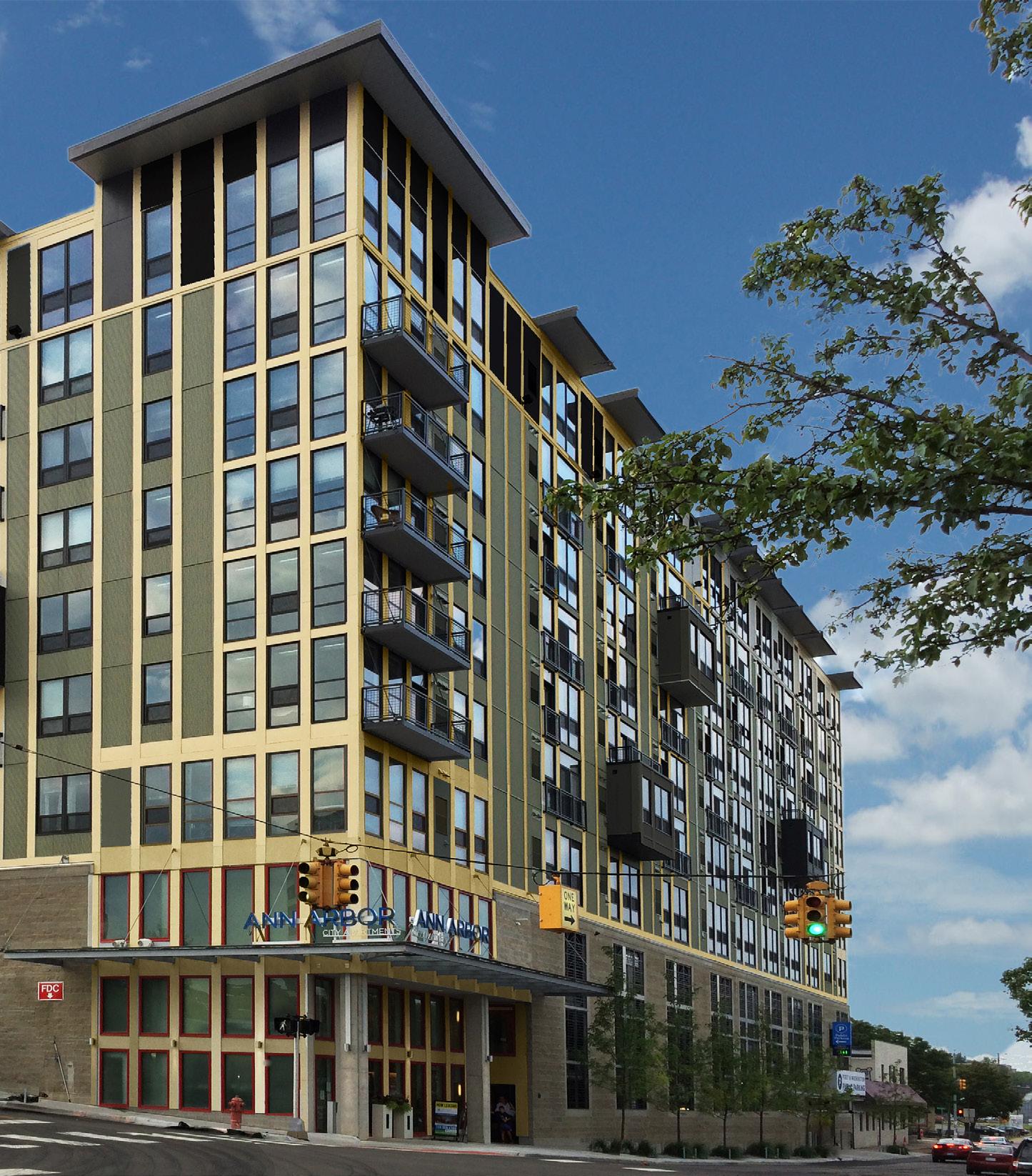 The design aesthetic honors Ann Arbor’s distinctive downtown character through a classic composition of base, middle, and top. A carefully selected color palette reflects the vibrant tones found along downtown streets, while the overall design evokes the refined elegance of a contemporary pinstriped suit. The façade’s rhythmic window pattern establishes visual order, and the base is articulated with smooth and rock-faced CMU bands complemented by ornamental open grillwork to enhance the pedestrian experience.