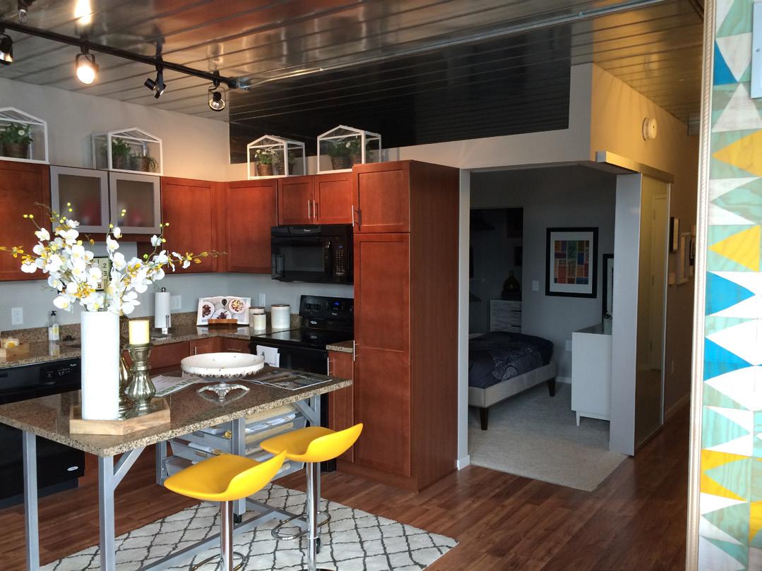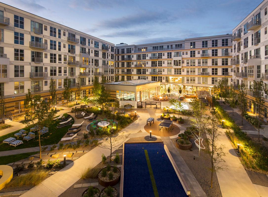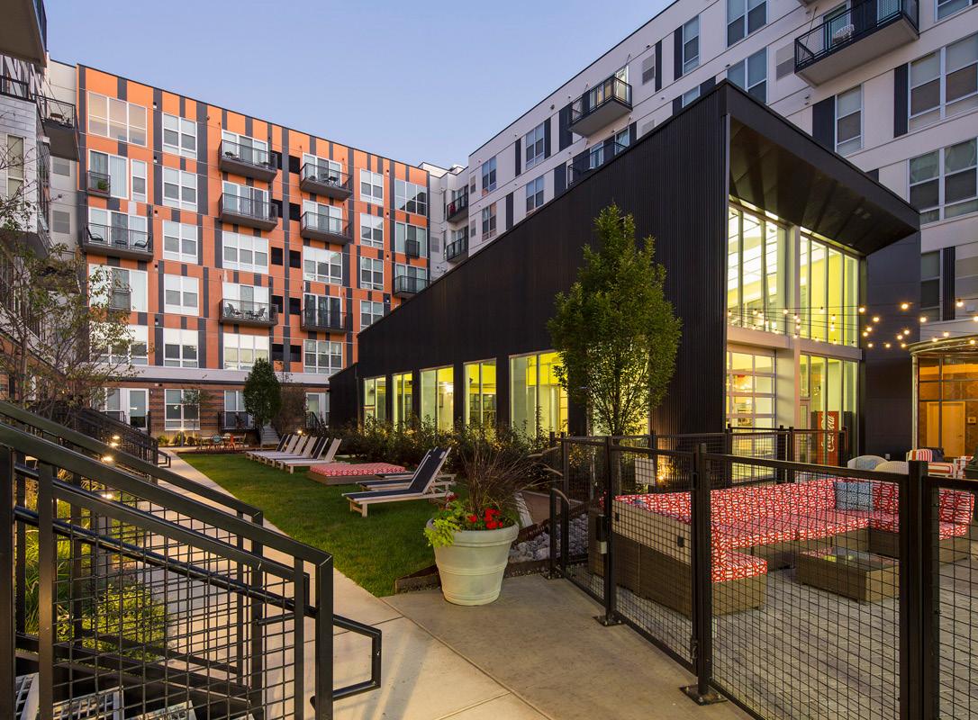 Bloomfield apartments blending industrial design, landscaped courtyard, and modern amenities.