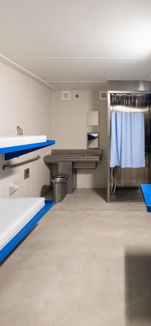 The 94-bed jail includes 11 separations, a special unit (12 beds), max and general population units for men and women, trustee dorms, and flexible housing. The intake center features a sallyport, officer work area, detox and holding cells, and a padded cell. Jail support areas include medical, kitchen, and laundry facilities. The Sheriff’s Office houses administration, training, evidence processing, patrol work areas, locker rooms, and a staff break area.