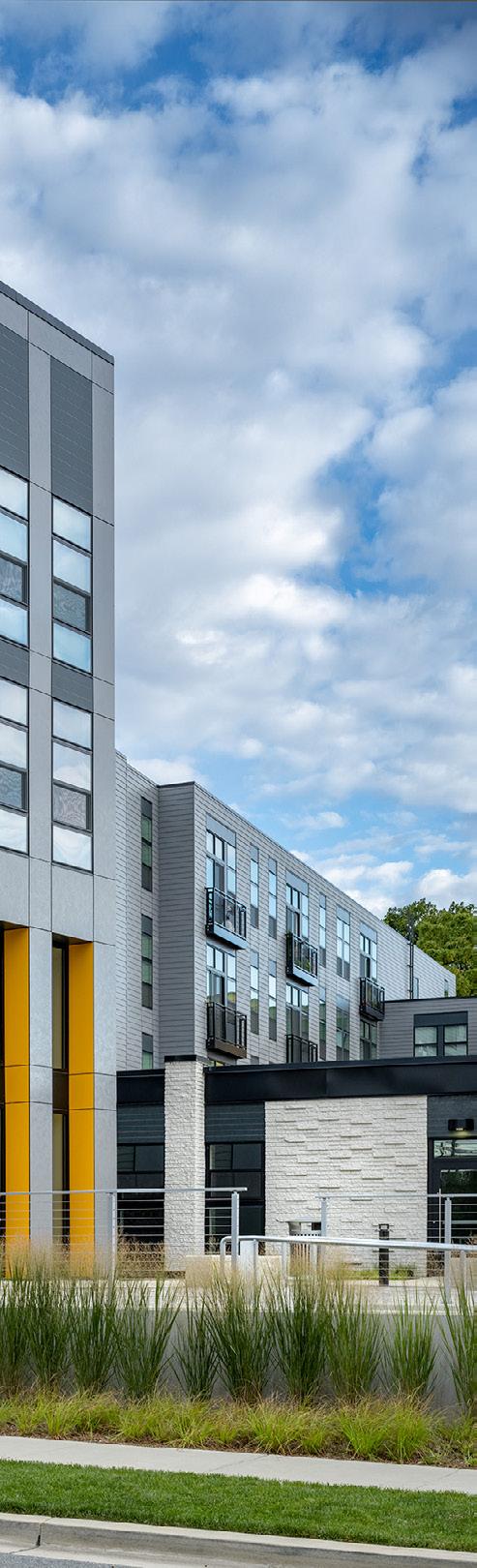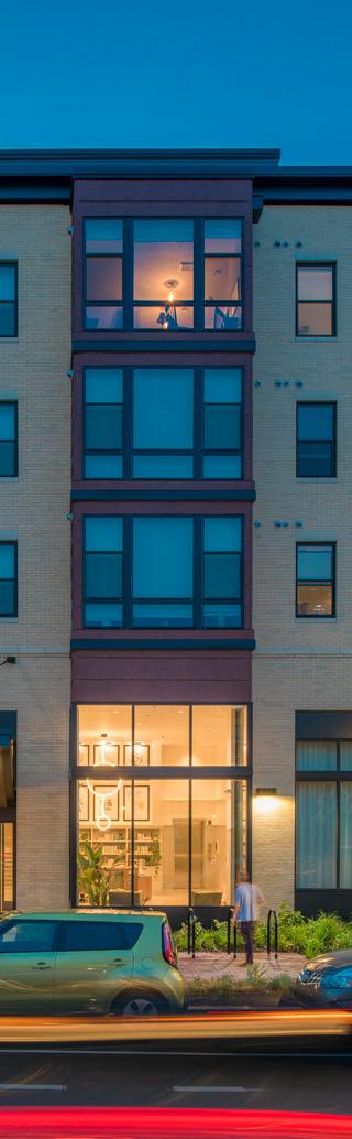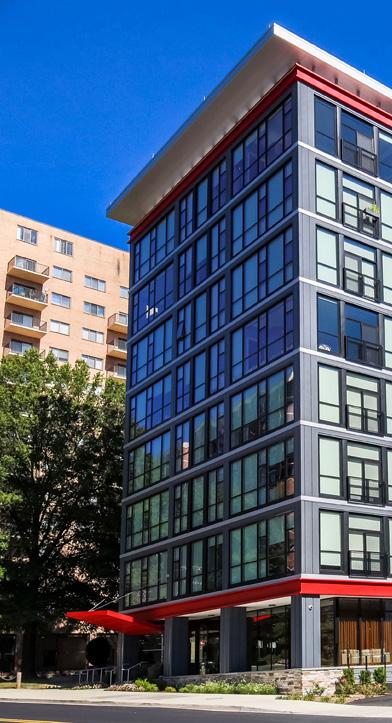 Meridian Hill Hall in Washington, DC has been redeveloped as âme, an 8-story, concrete frame and brick building located across the north side of Meridian Hill Park on 16th Street. After its use as a women’s hotel, the building was used as a student dormitory by Howard University since 1969, and was renovated to offer the community 206 luxury rental units. The design includes studios, and one- and twobedroom units.