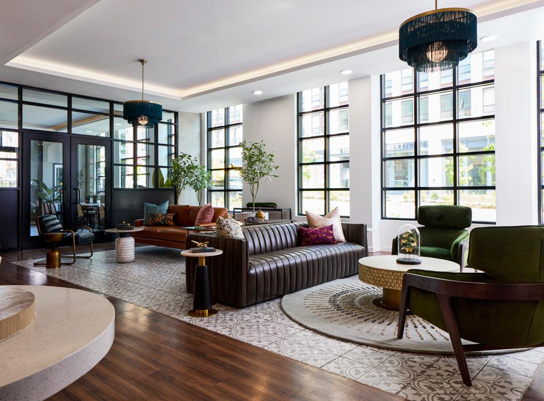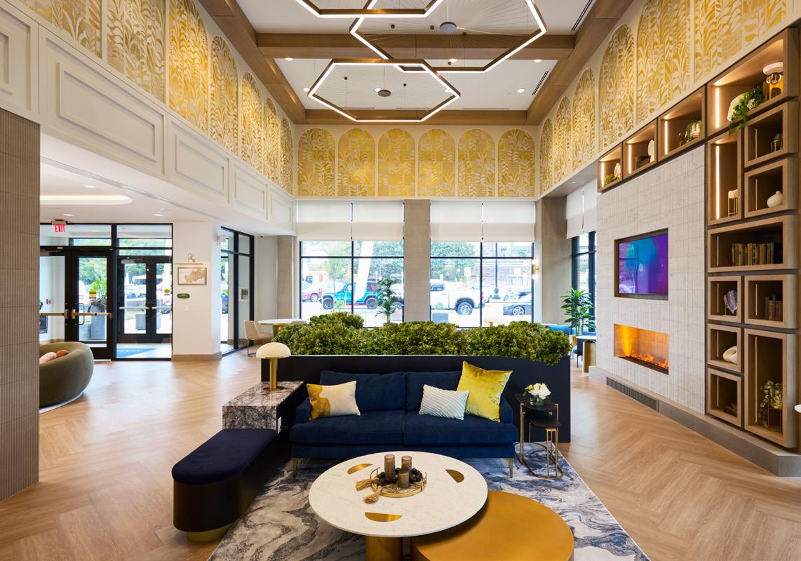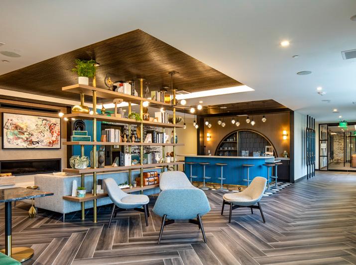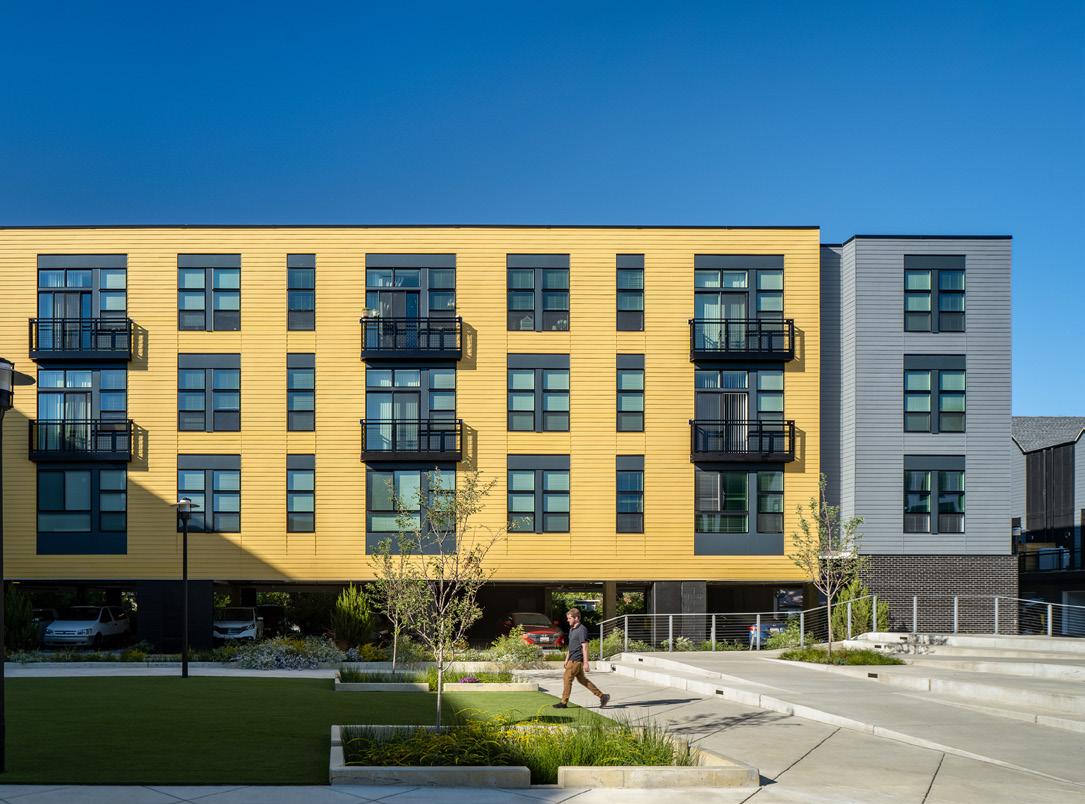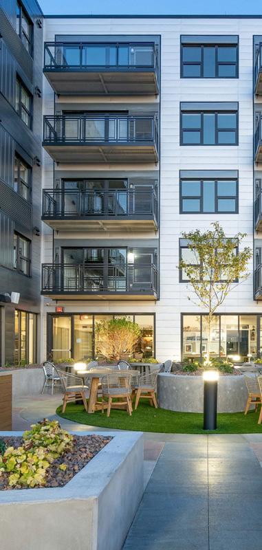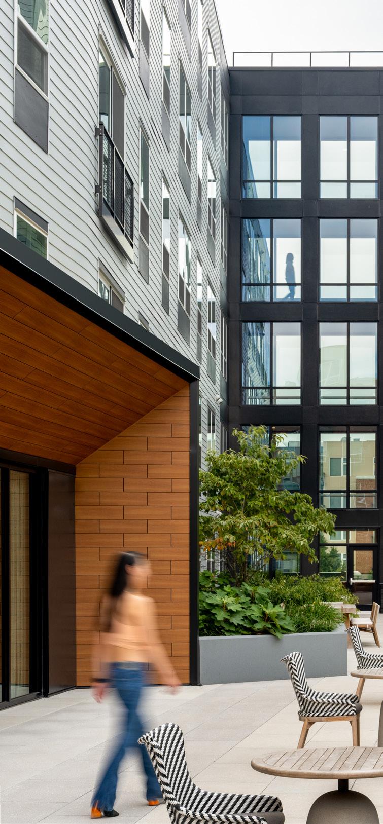 The residential community features multiple exterior courtyards and landscaped patios, providing spaces for relaxation and socialization. Inside, residents are welcomed into a market-style café highlighting local coffee and baked goods, and interiors incorporate handcrafted millwork, a playful muted color palette, and artwork by local makers. Every detail was designed to foster a sense of warmth, comfort, and connection, ensuring a home-like environment for all residents.