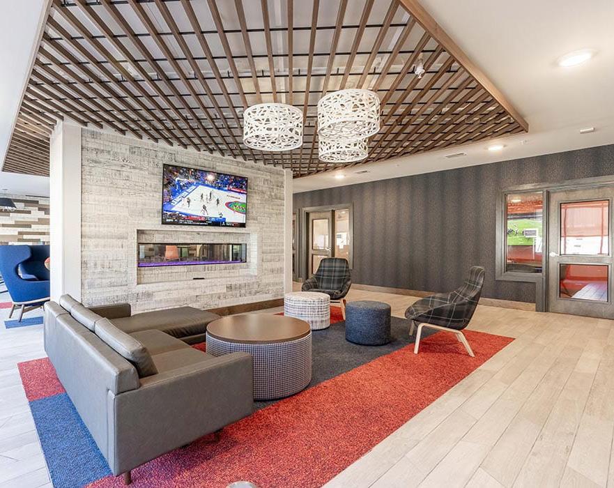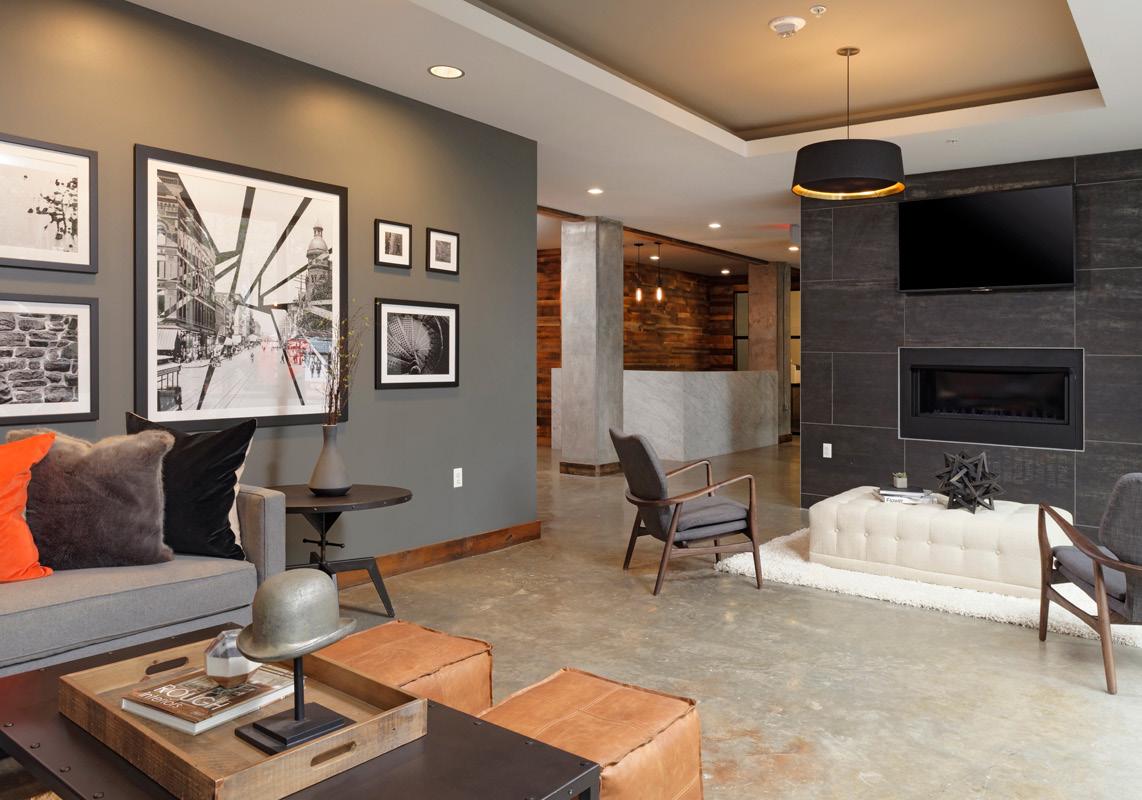 Project amenities include an exterior courtyard with seating and game areas, an outdoor pool terrace with grilling stations. A clubroom with fireplace and study areas, computer lounge, fitness center, tanning rooms, a golf simulator, and a secured parking garage.
