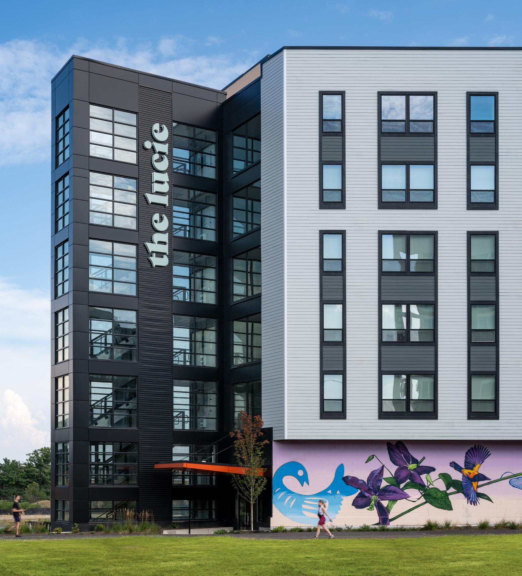 The Lucie offers residents a number of attractive studio, one-, and two-bedroom floorplans ranging from 507 to 1,317 square feet. The Lucie will also contain approximately 23,000 square feet of amenity space, providing residents the most comprehensive and quality amenity package currently available in Brewers Hill. The southwest corner is a junction to the Rails-To-Trails amenity, with a small space dedicated to bike repair/resting area; and the north corner is an entry point into the building as well as a resting place for Rails-To-Trails users. Building materials and landscape treatments complement these uses to strengthen the relationship between the building and the trail. Glazing on the building entrance and tower element establish a hierarchy in the solid-void relationship. Canopy element has also been emphasized as a structure with a contrasting color to help establish a definitive entrance into the building lobby.